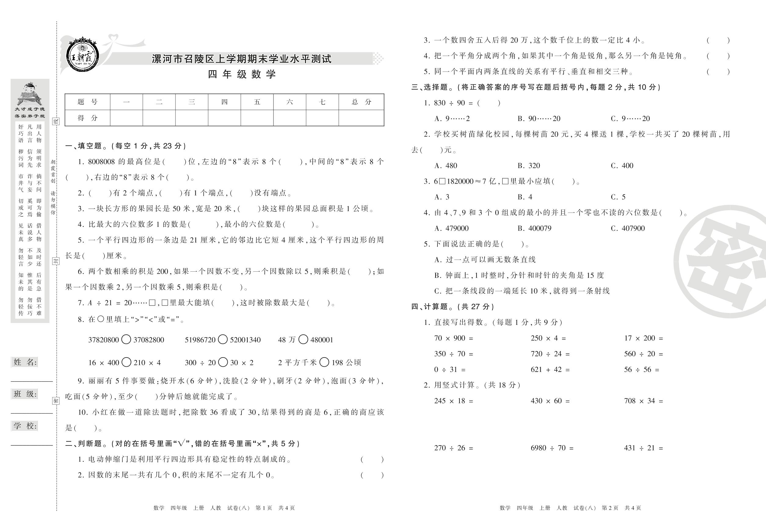 2016-2017学年第一学期漯河市召陵区四年级数学试卷(人教版)【8】
