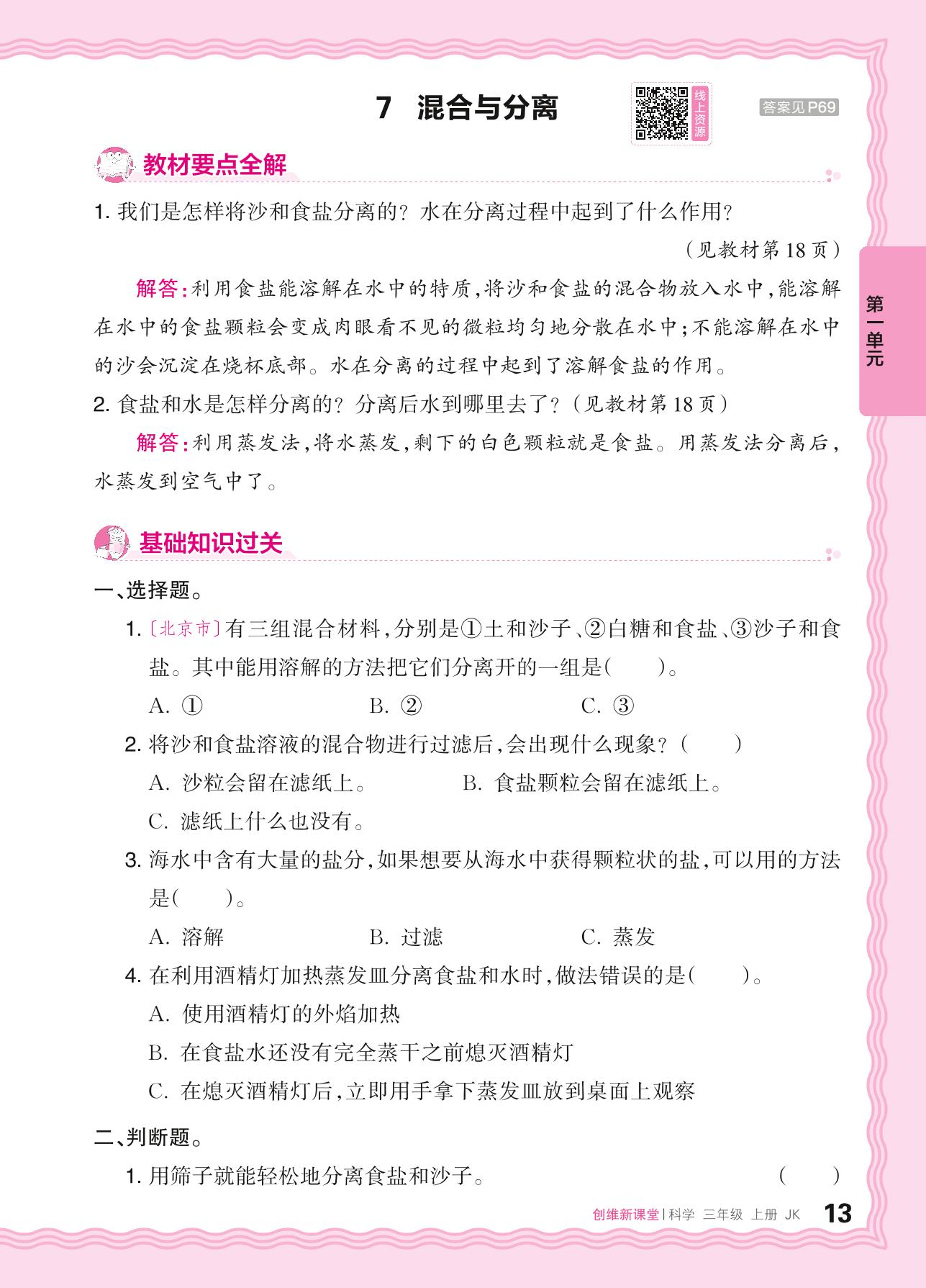 2024秋上册三年级科学教科版 第一单元 水——7. 混合与分离