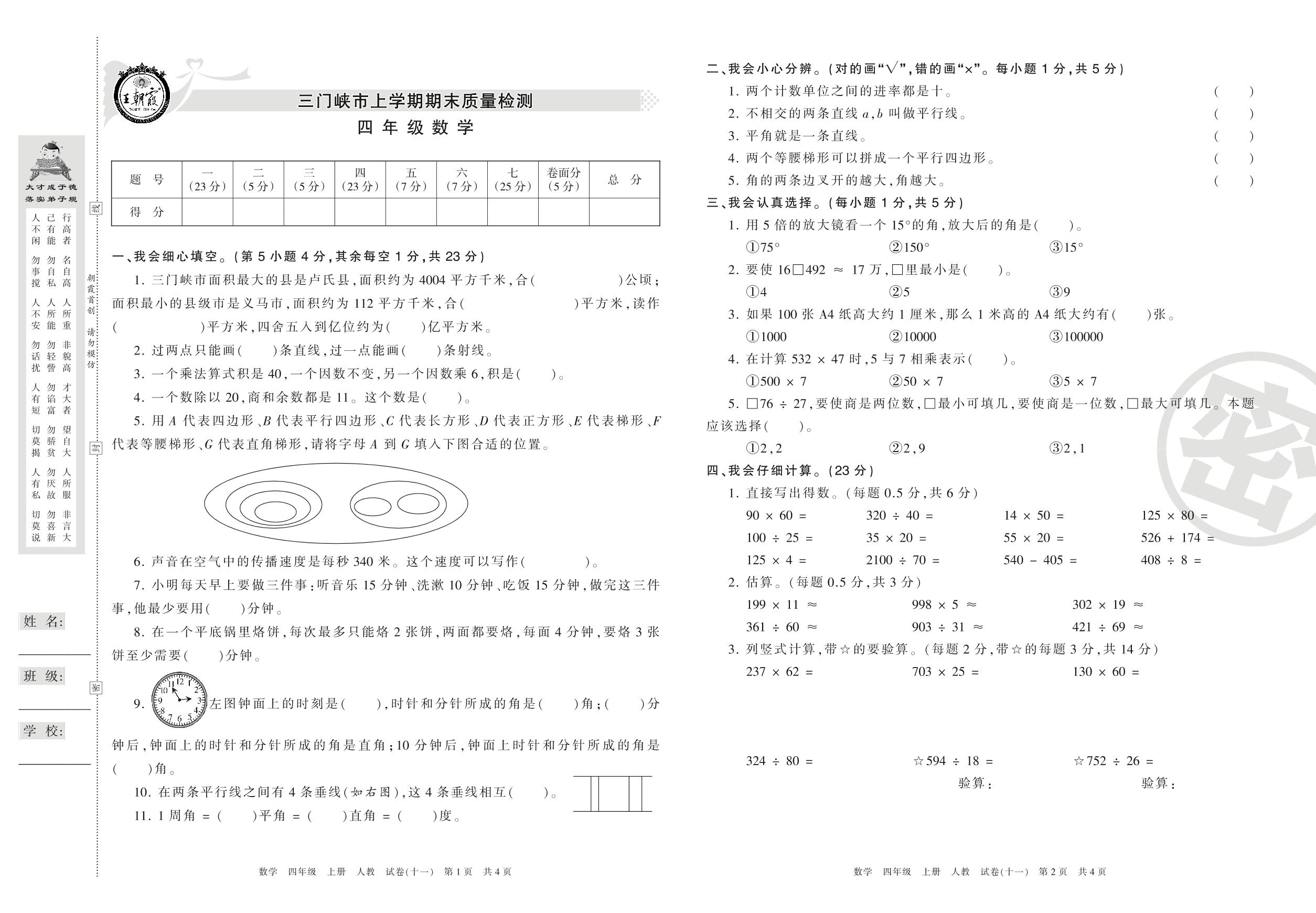 2016-2017学年第一学期三门峡市四年级数学试卷(人教版)【11】