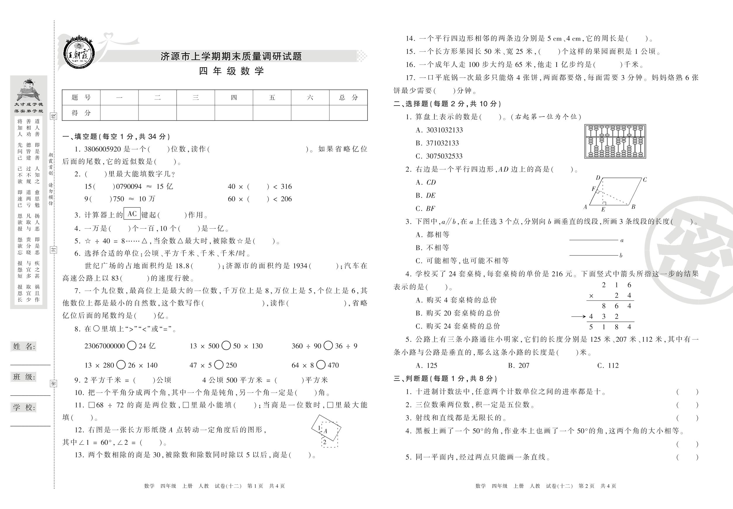 2016-2017学年第一学期济源市四年级数学试卷(人教版)【12】
