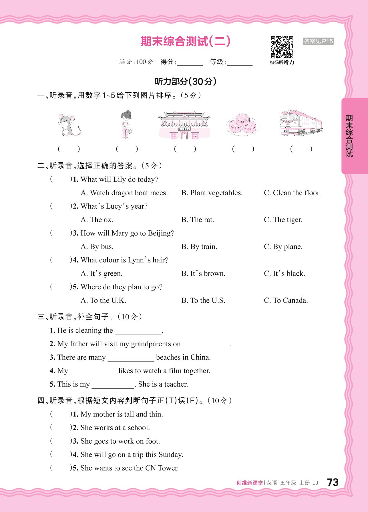 2024秋上册五年级英语冀教版 期末综合测试(二)