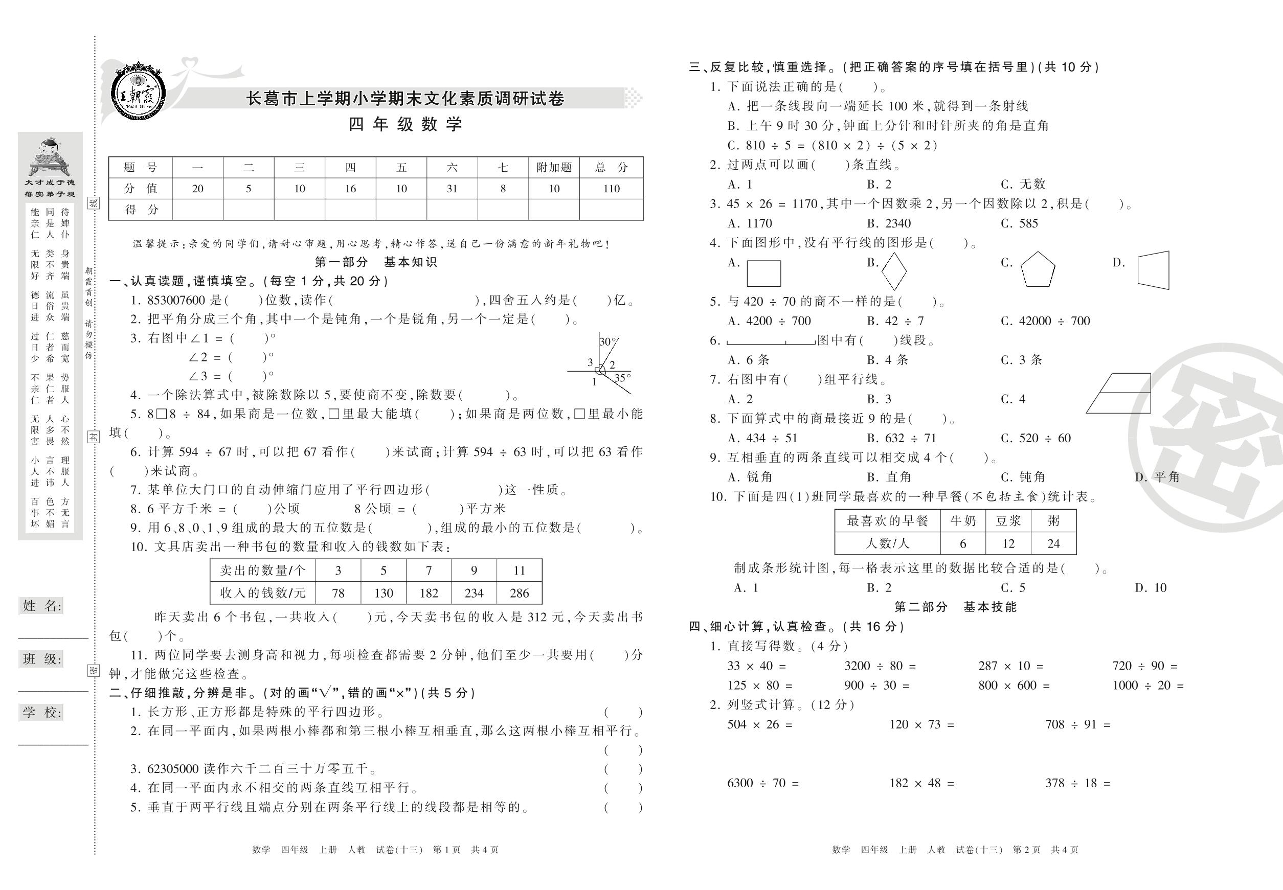 2016-2017学年第一学期长葛市四年级数学试卷(人教版)【13】