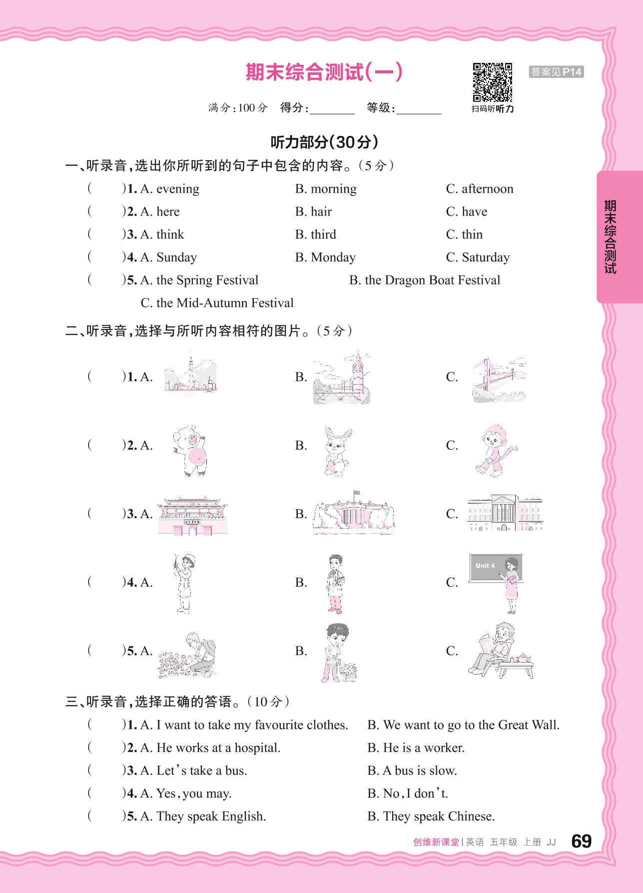 2024秋上册五年级英语冀教版 期末综合测试(一)
