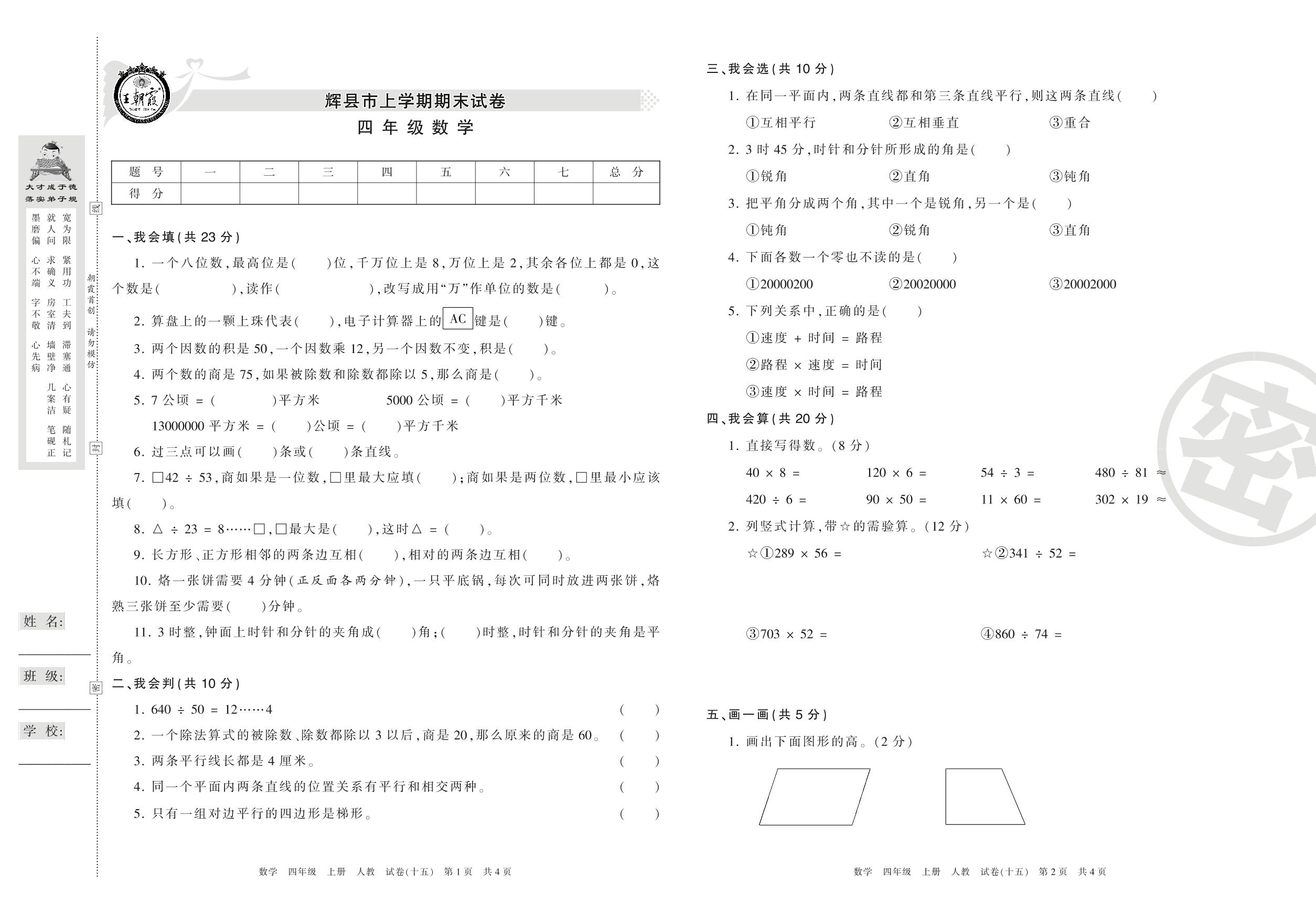 2016-2017学年第一学期辉县市四年级数学试卷(人教版)【15】