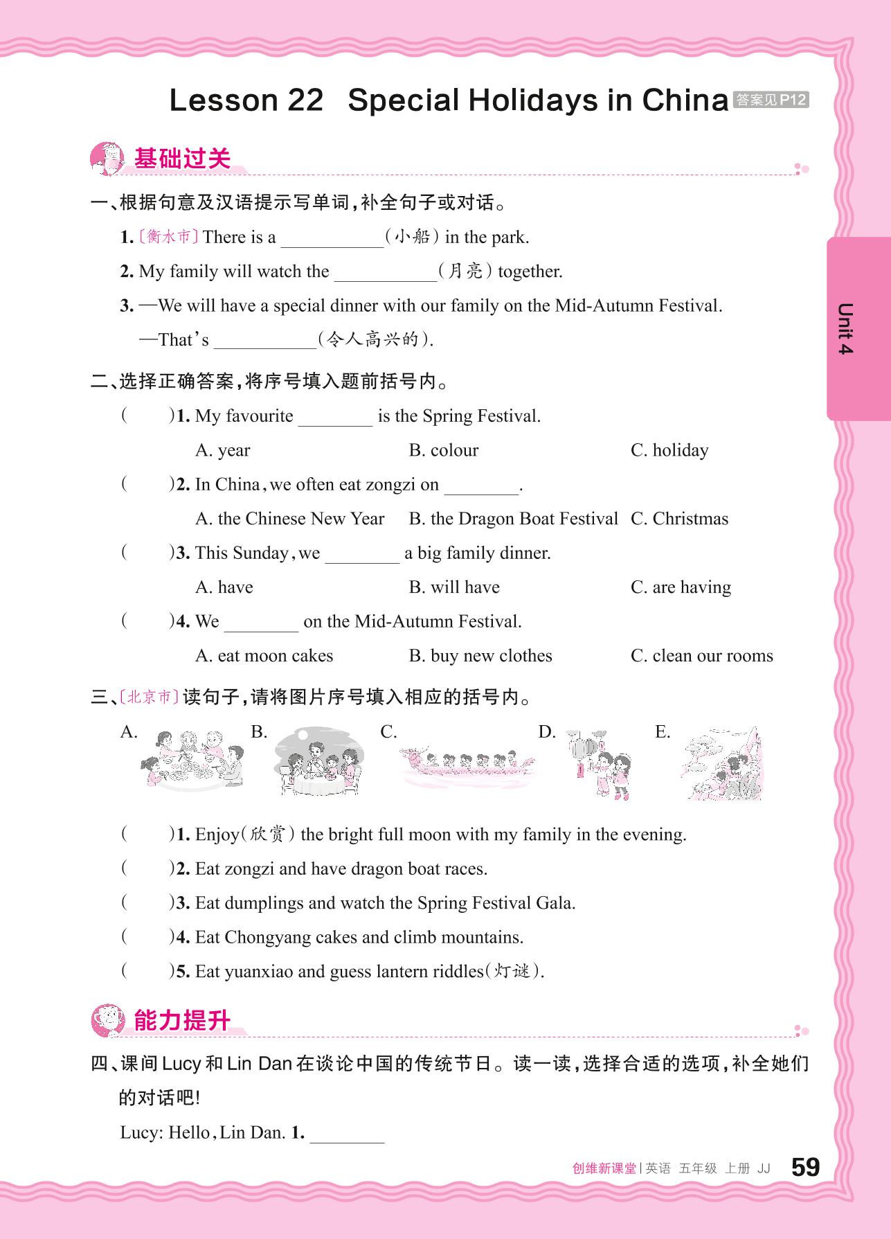 2024秋上册五年级英语冀教版 Unit 4—Lesson 22 Special Holidays in China