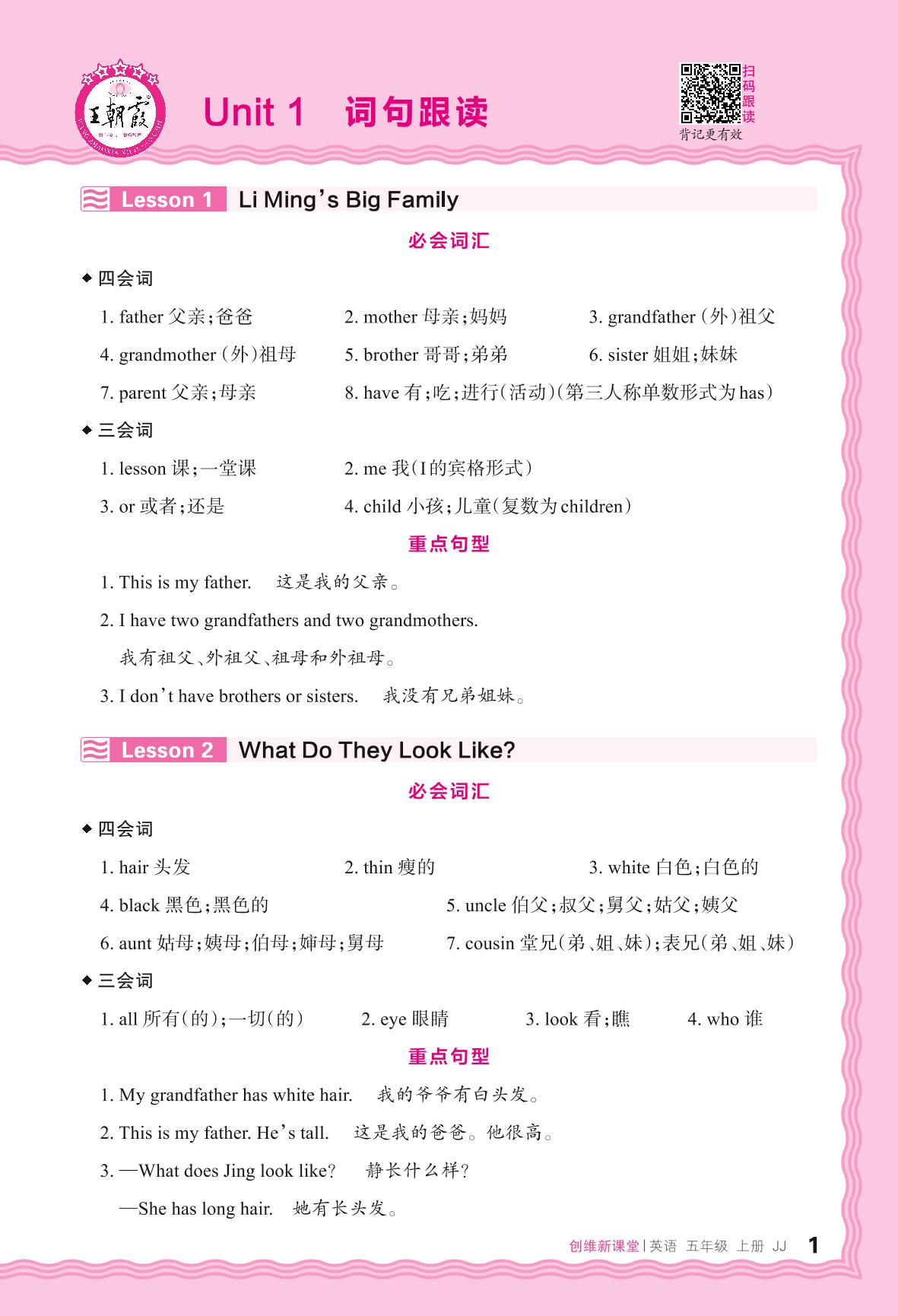 2024秋上册五年级英语冀教版 Unit 1 词句跟读