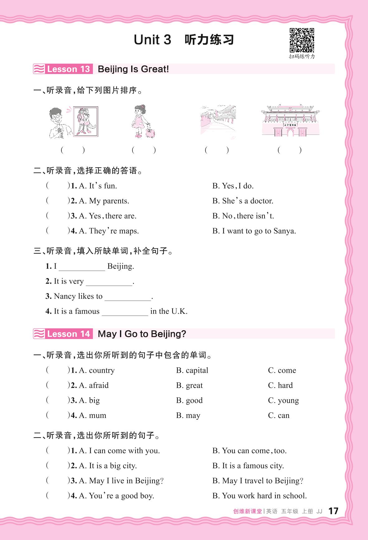 2024秋上册五年级英语冀教版 Unit 3 听力练习