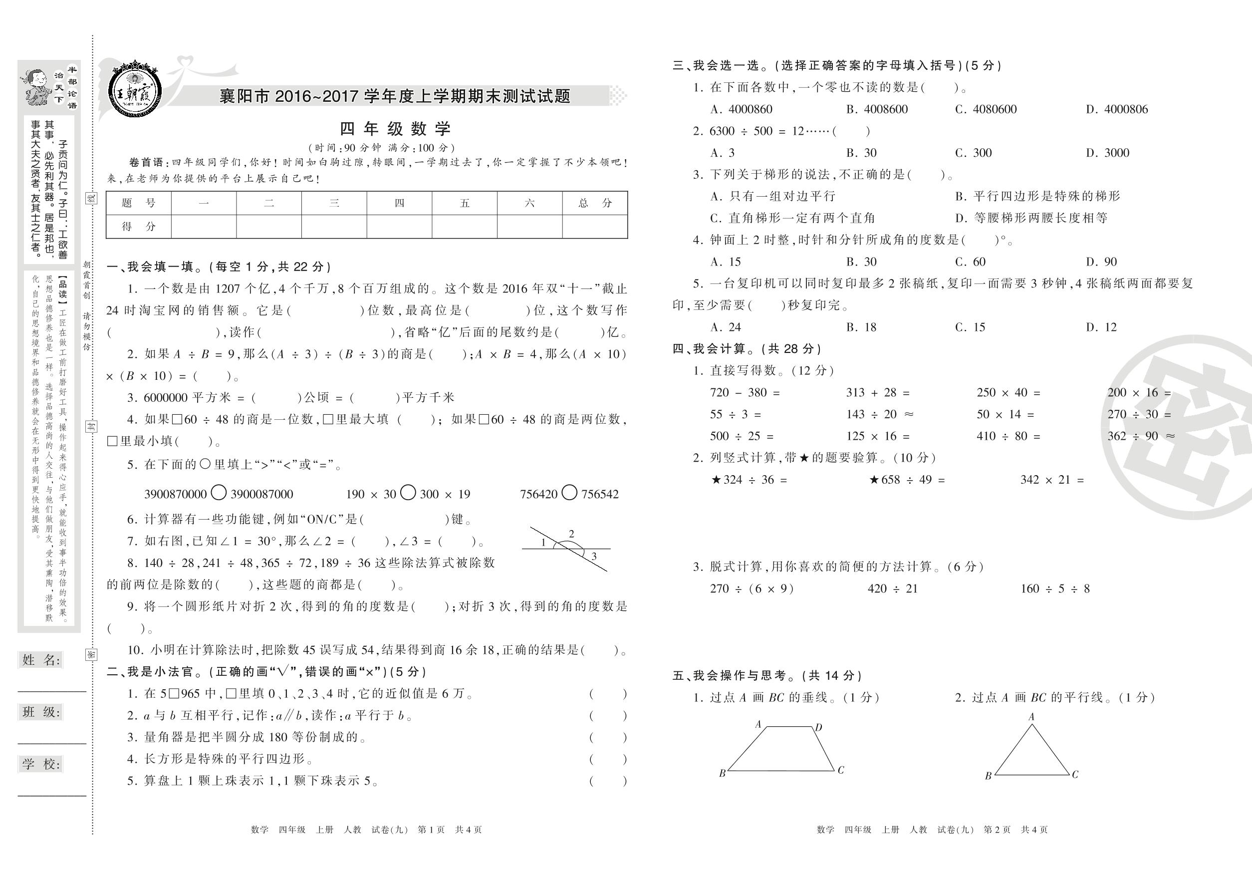2016-2017学年第一学期襄阳市四年级数学试卷(人教版)【9】