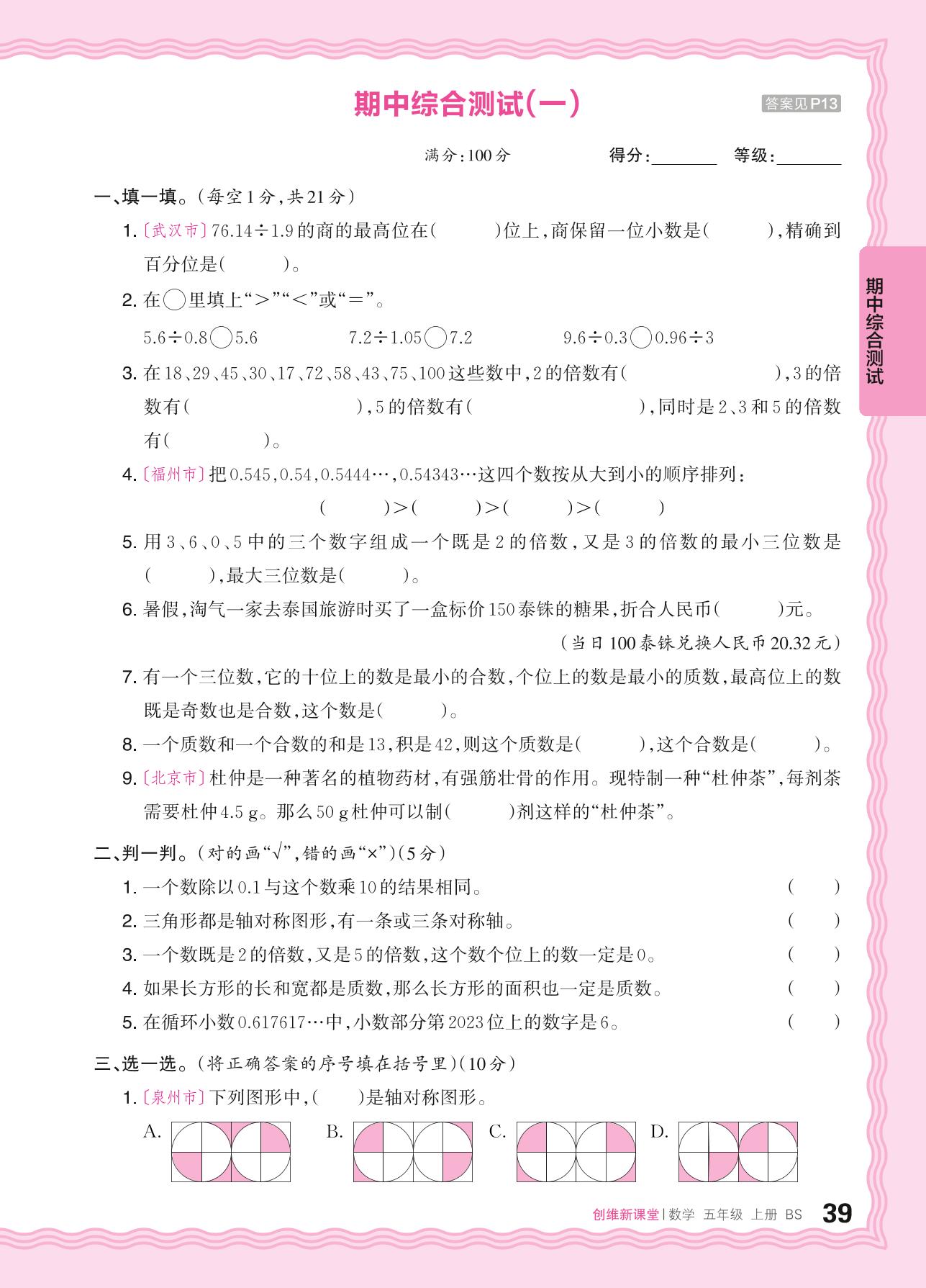 2024秋上册五年级数学北师版 期中综合测试(一)