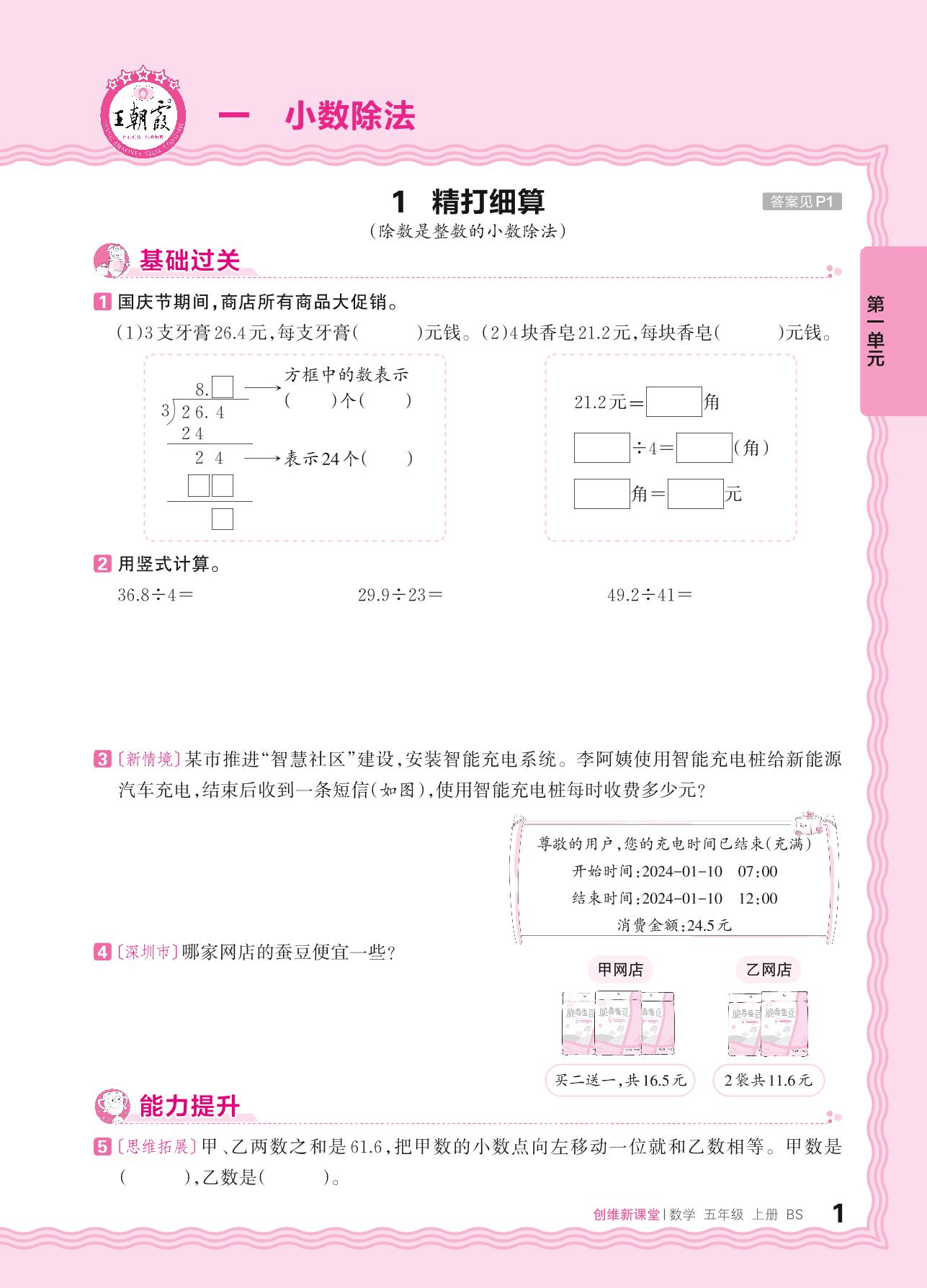 2024秋上册五年级数学北师版 第一单元 小数除法——1. 精打细算