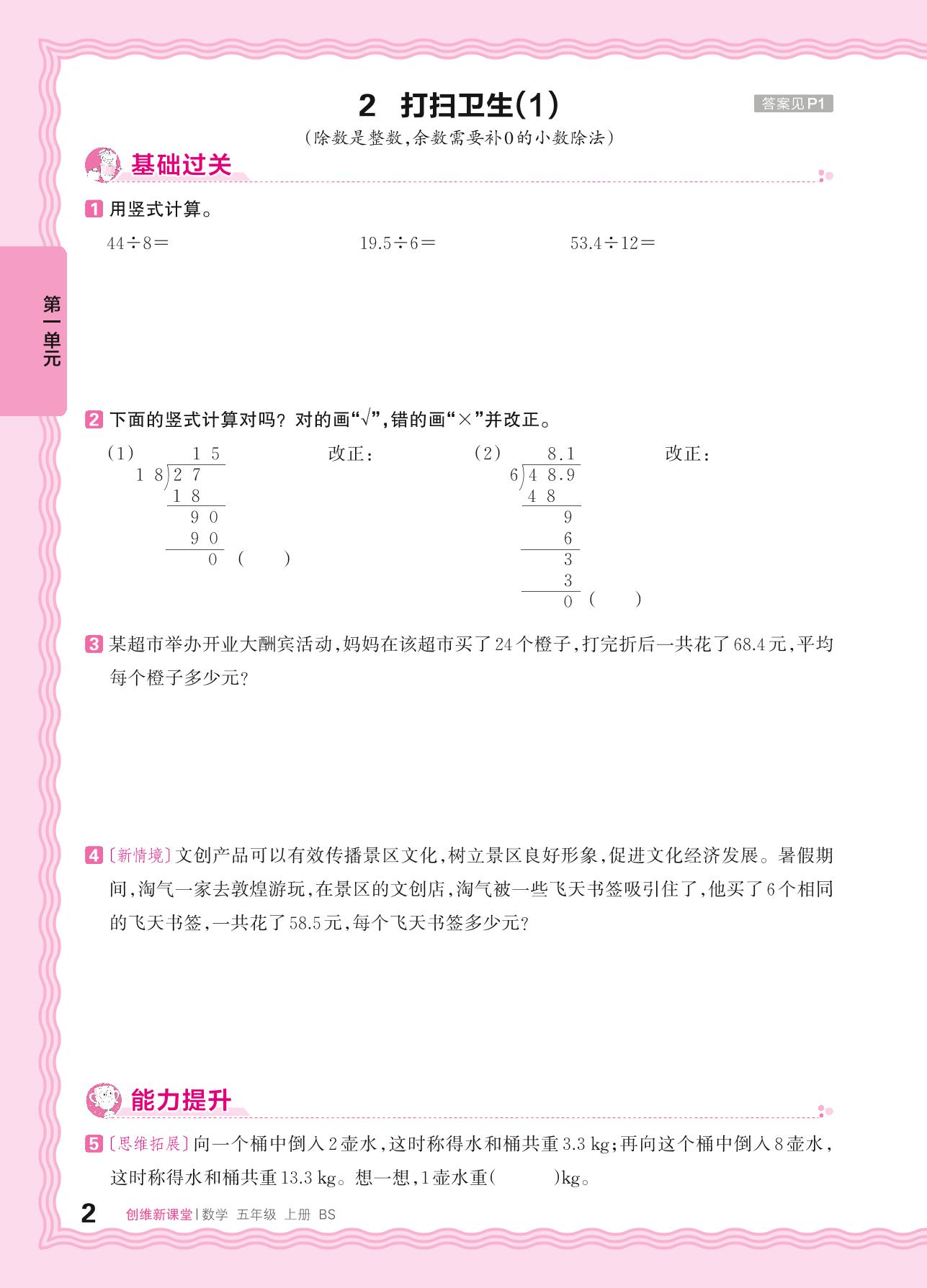 2024秋上册五年级数学北师版 第一单元 小数除法——2. 打扫卫生(1)