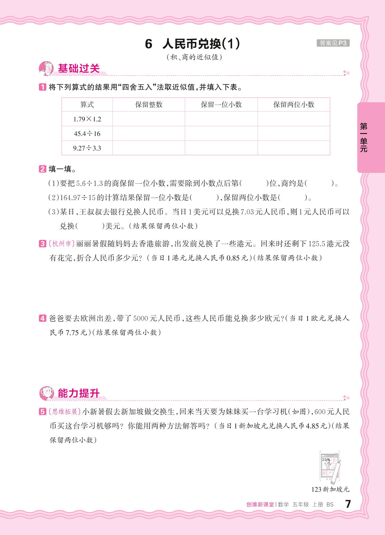 2024秋上册五年级数学北师版 第一单元 小数除法——6. 人民币兑换(1)