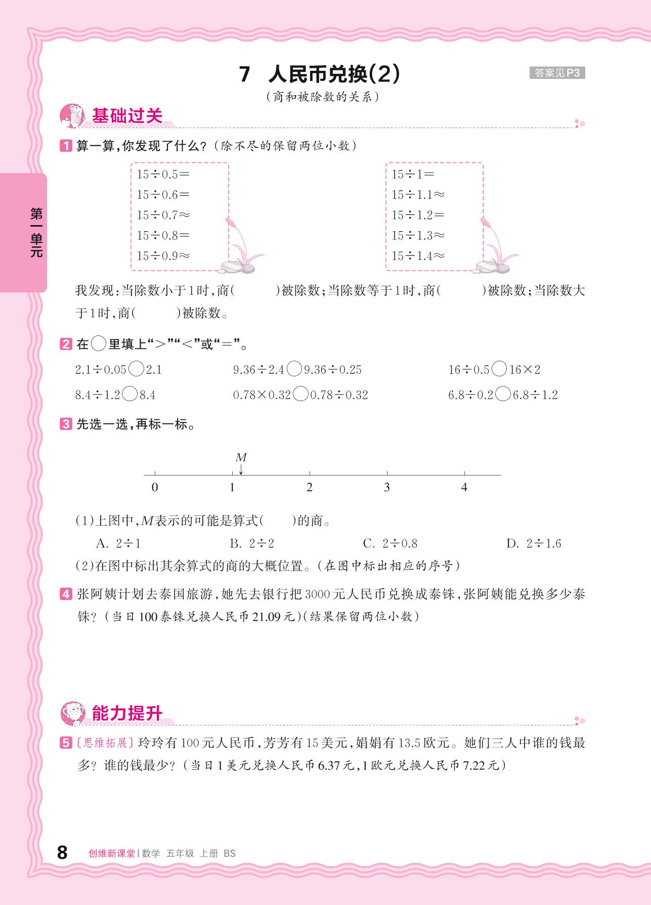 2024秋上册五年级数学北师版 第一单元 小数除法——7. 人民币兑换(2)