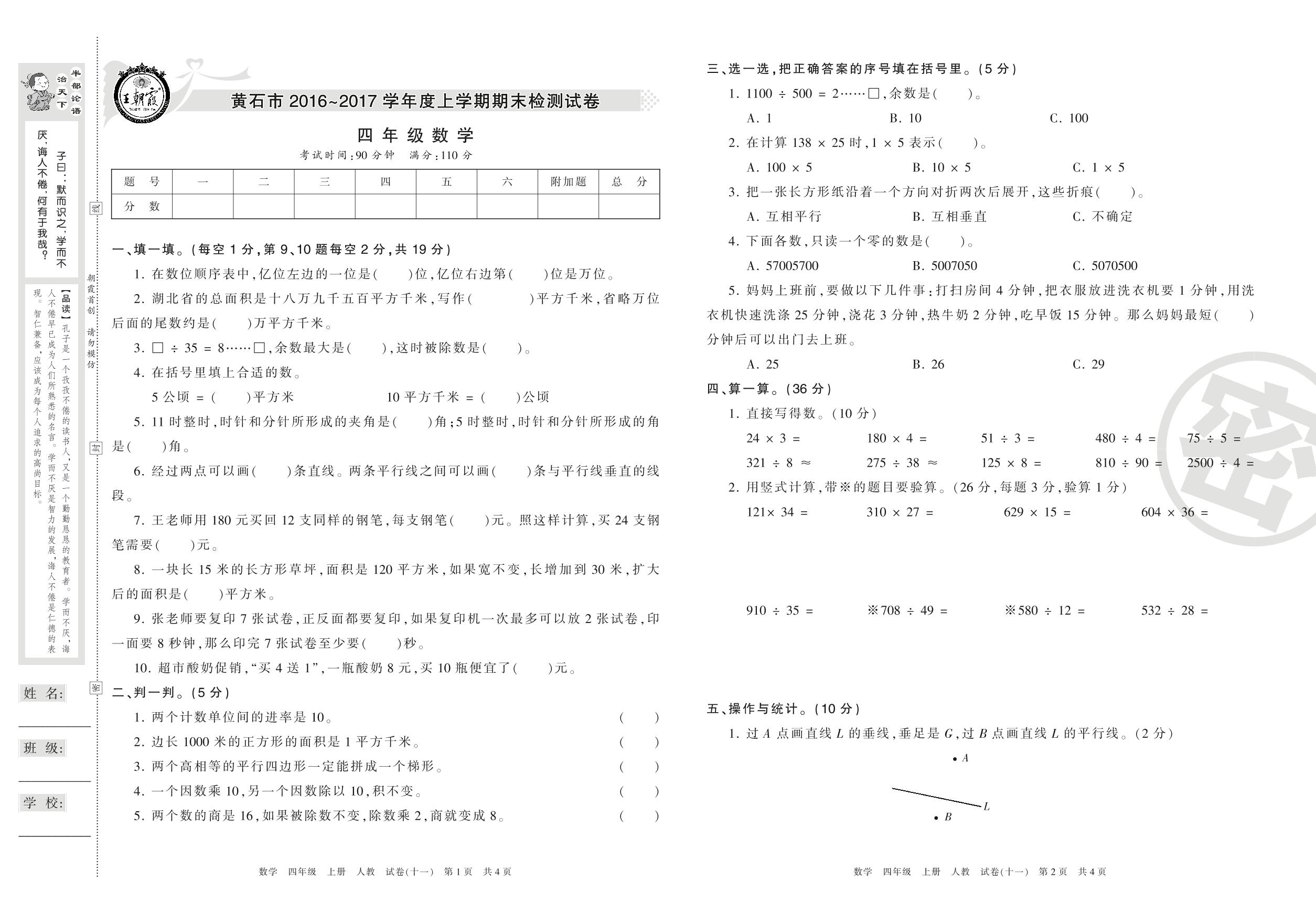 2016-2017学年第一学期黄石市四年级数学试卷(人教版)【11】