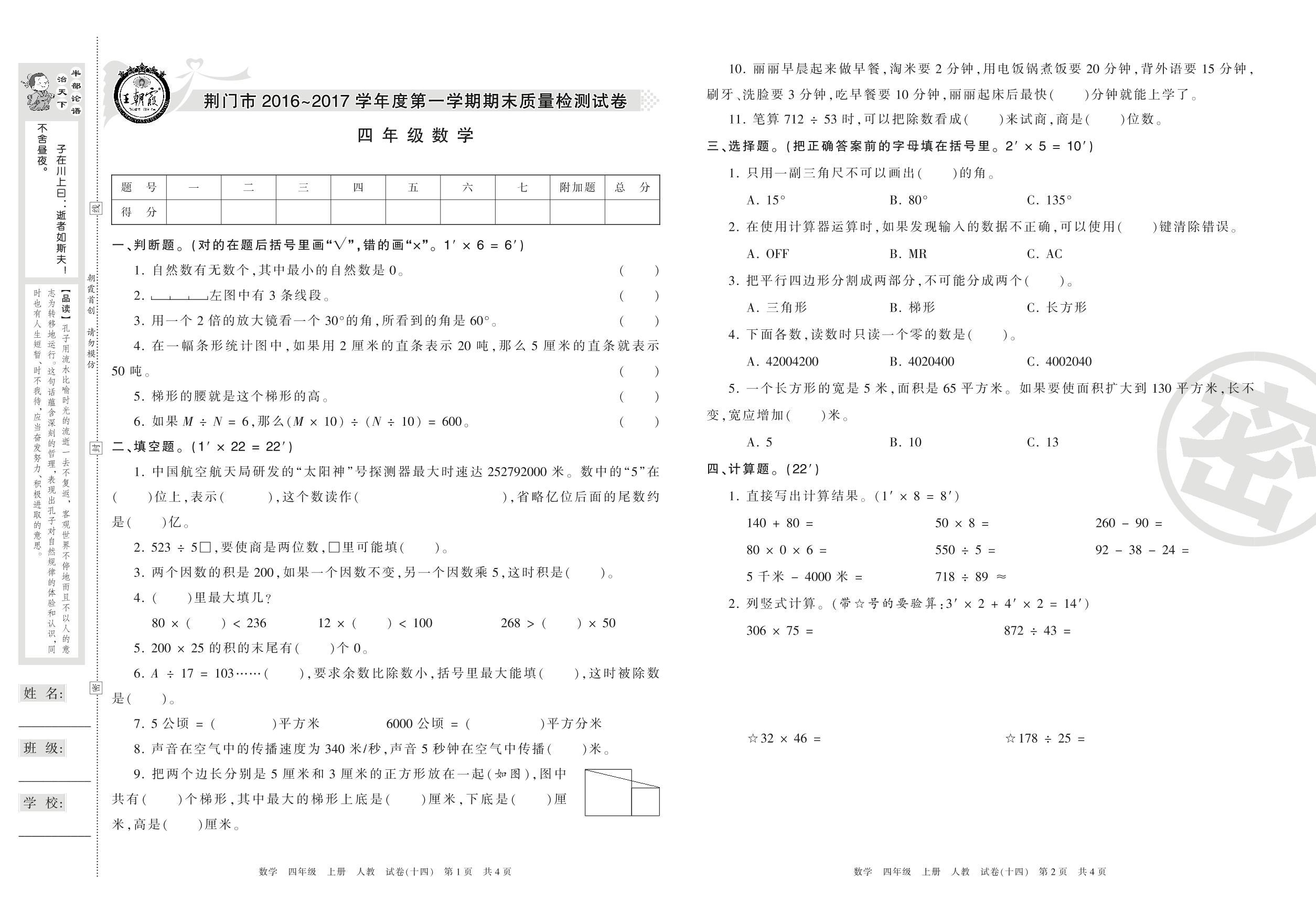 2016-2017学年第一学期荆门市四年级数学试卷(人教版)【14】