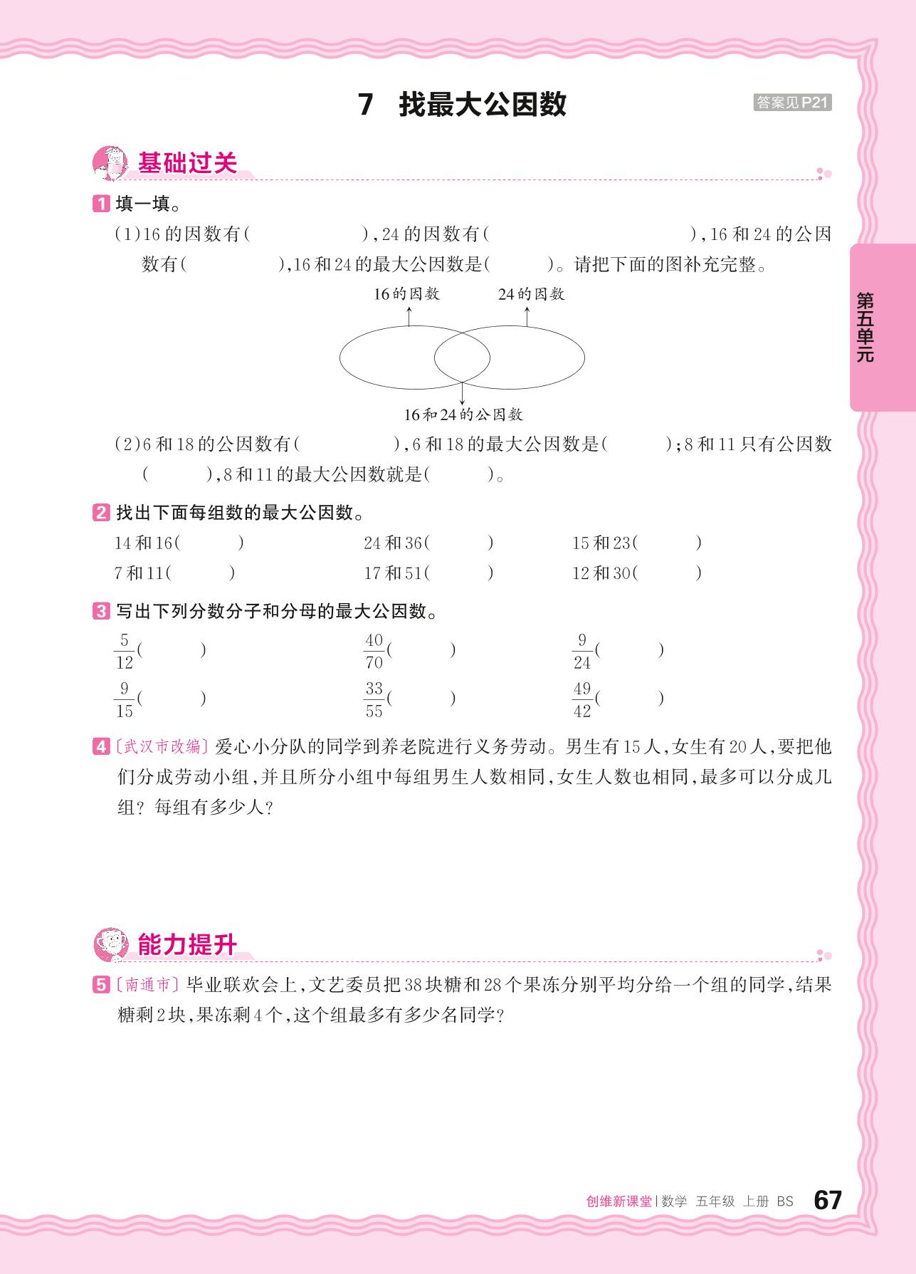 2024秋上册五年级数学北师版 第五单元 分数的意义——7. 找最大公因数