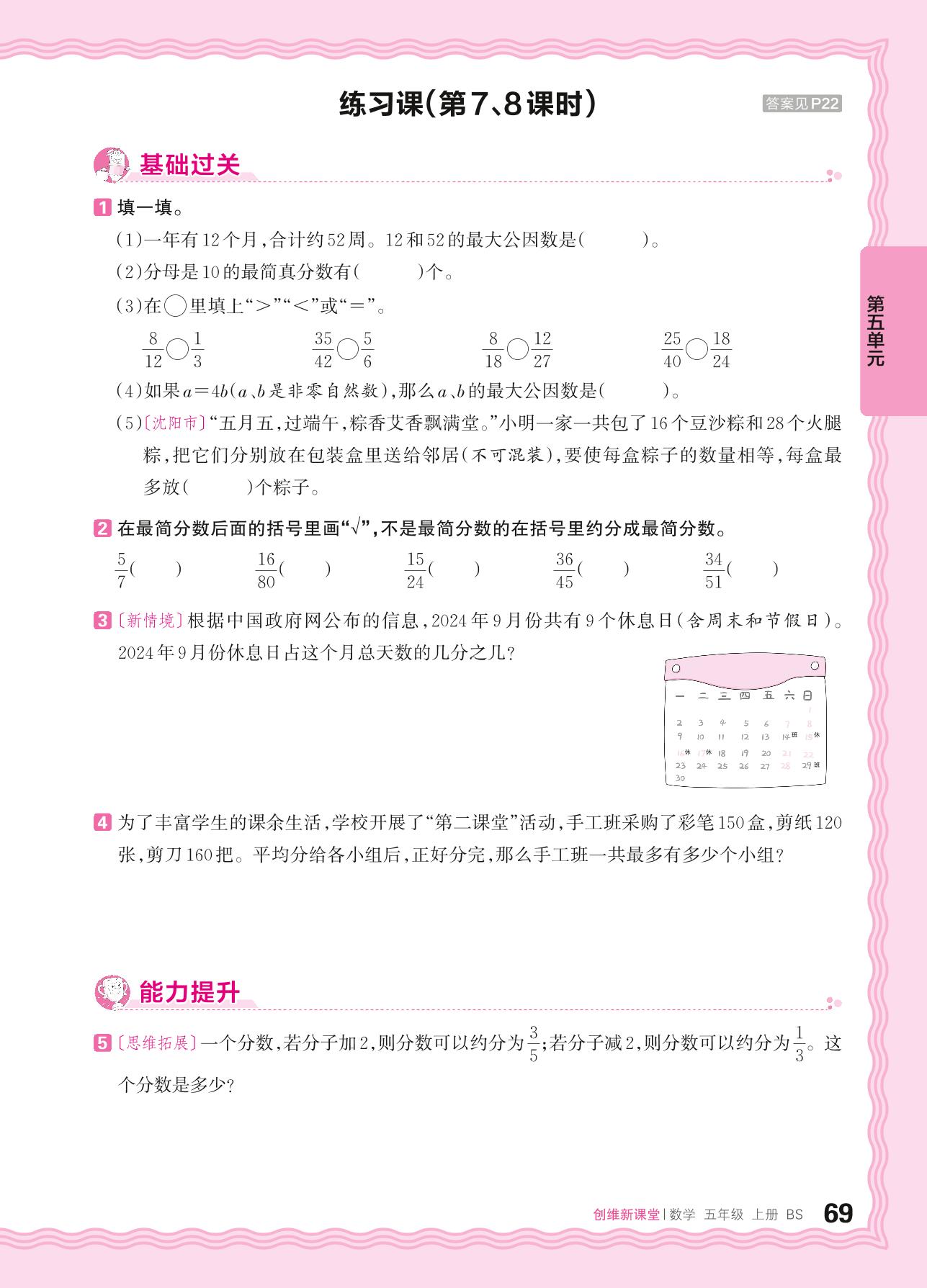 2024秋上册五年级数学北师版 第五单元 分数的意义——找最大公因数、约分练习课