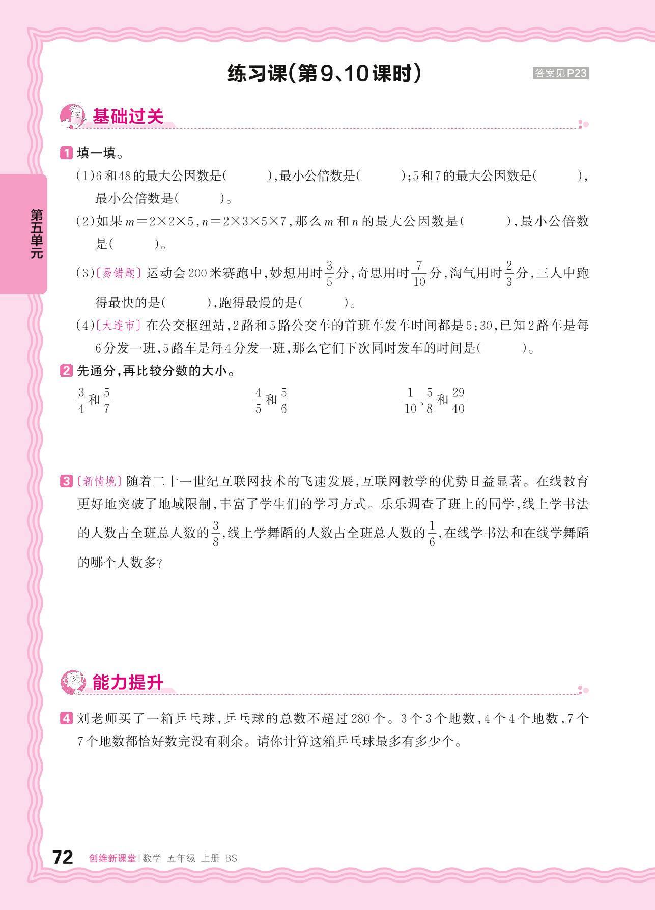 2024秋上册五年级数学北师版 第五单元 分数的意义——找最小公倍数、分数的大小练习课