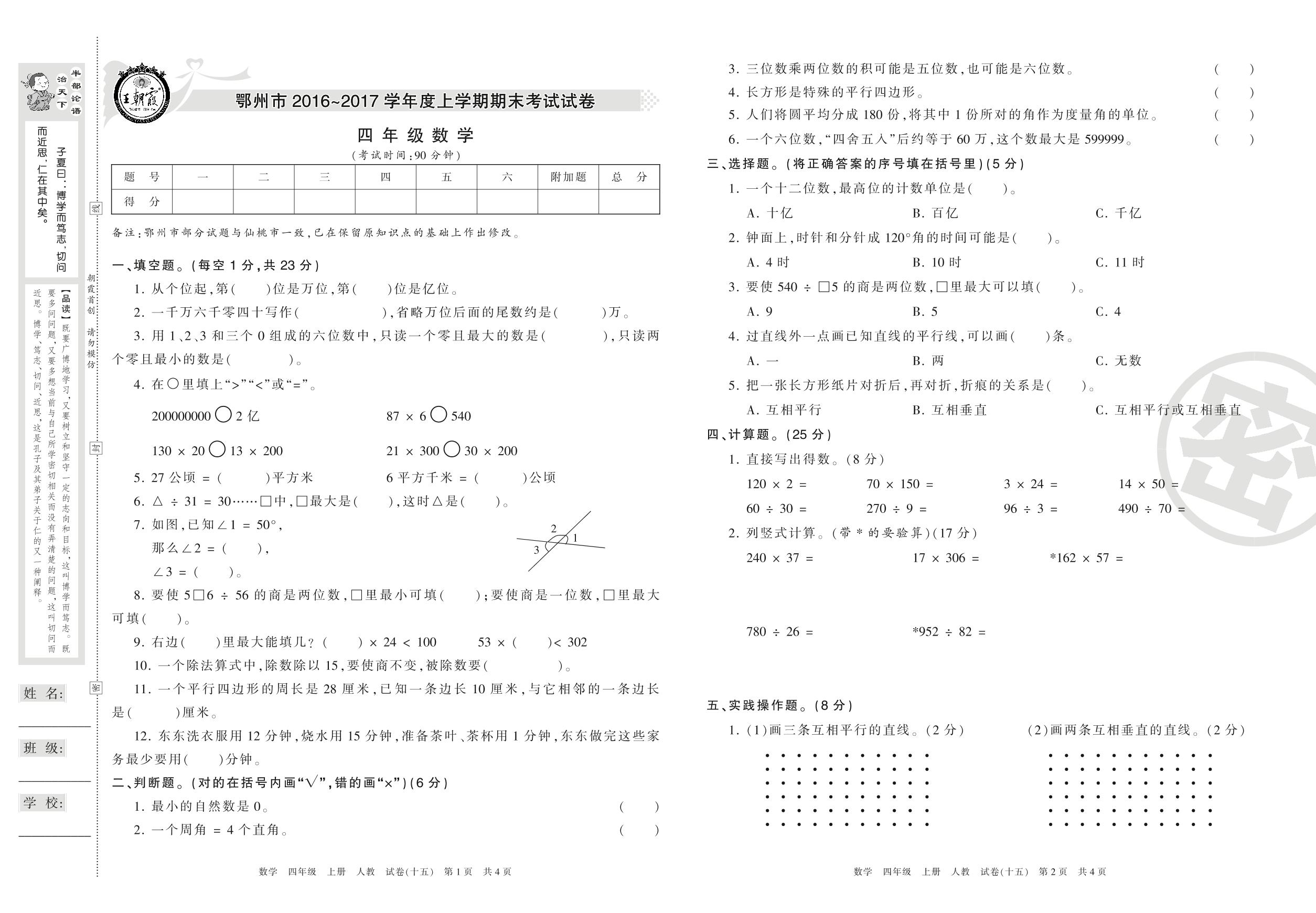 2016-2017学年第一学期鄂州市四年级数学试卷(人教版)【15】
