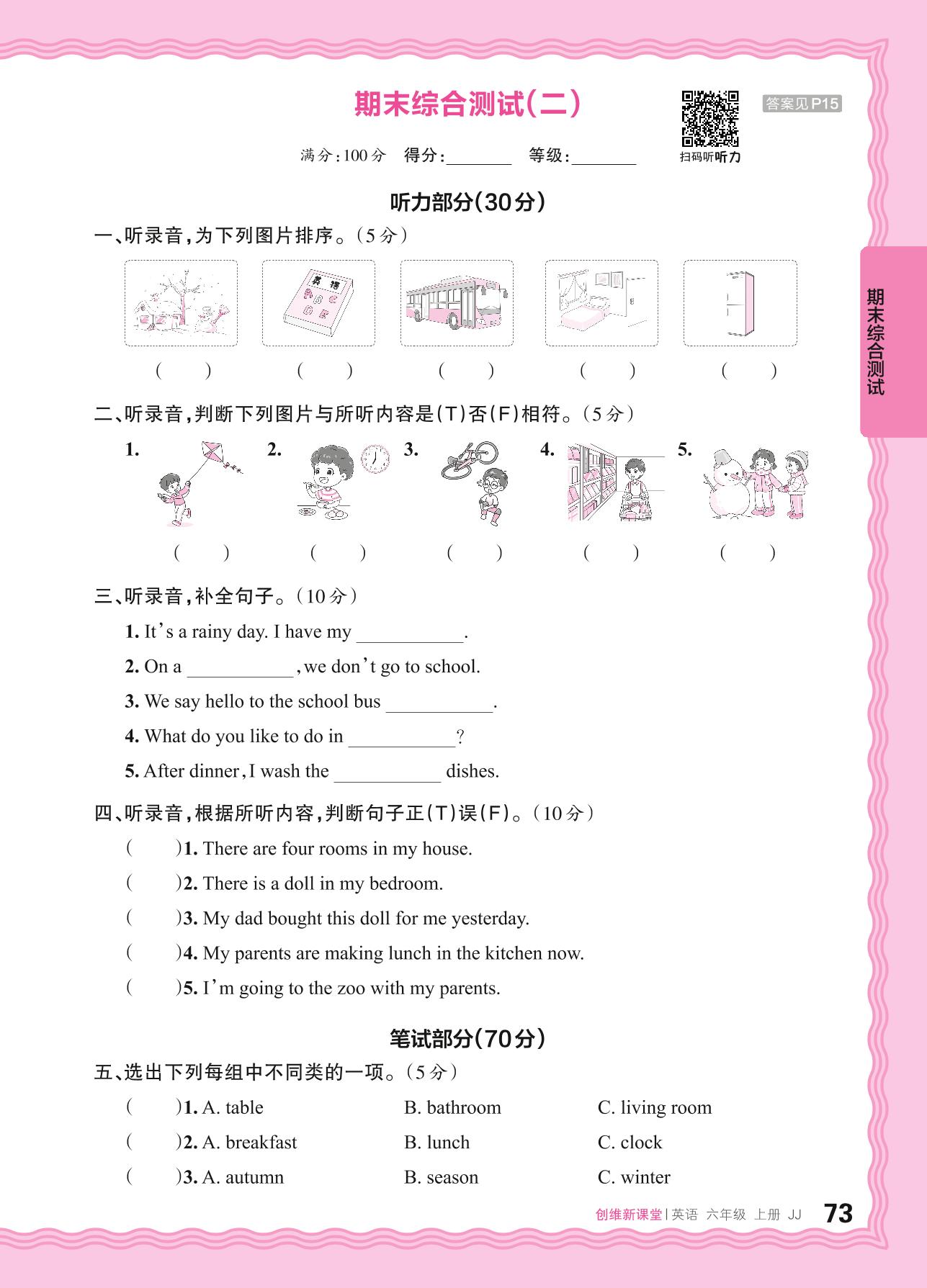 2024秋上册六年级英语冀教版 期末综合测试(二)
