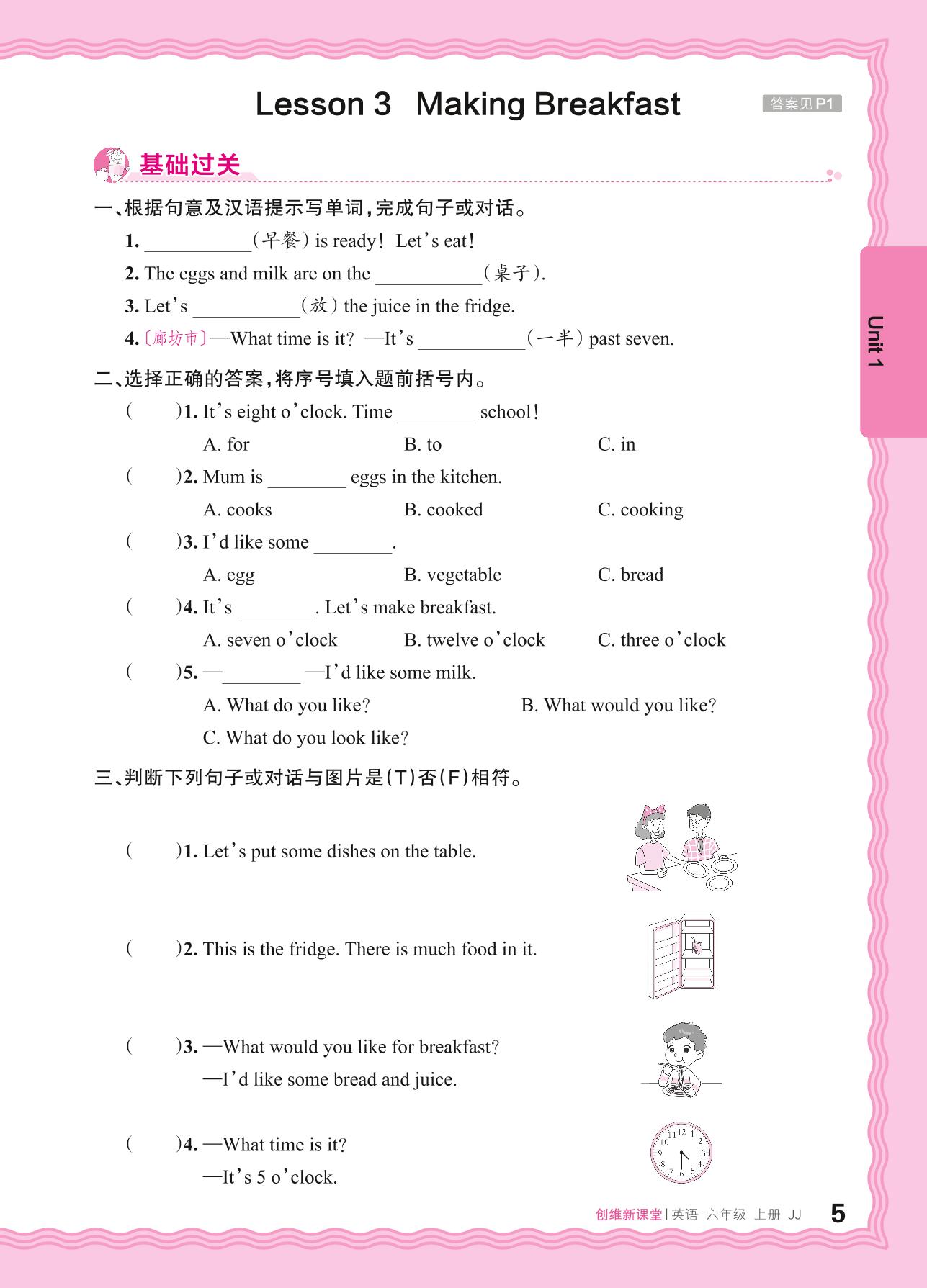 2024秋上册六年级英语冀教版 Unit 1—Lesson 3 Making Breakfast