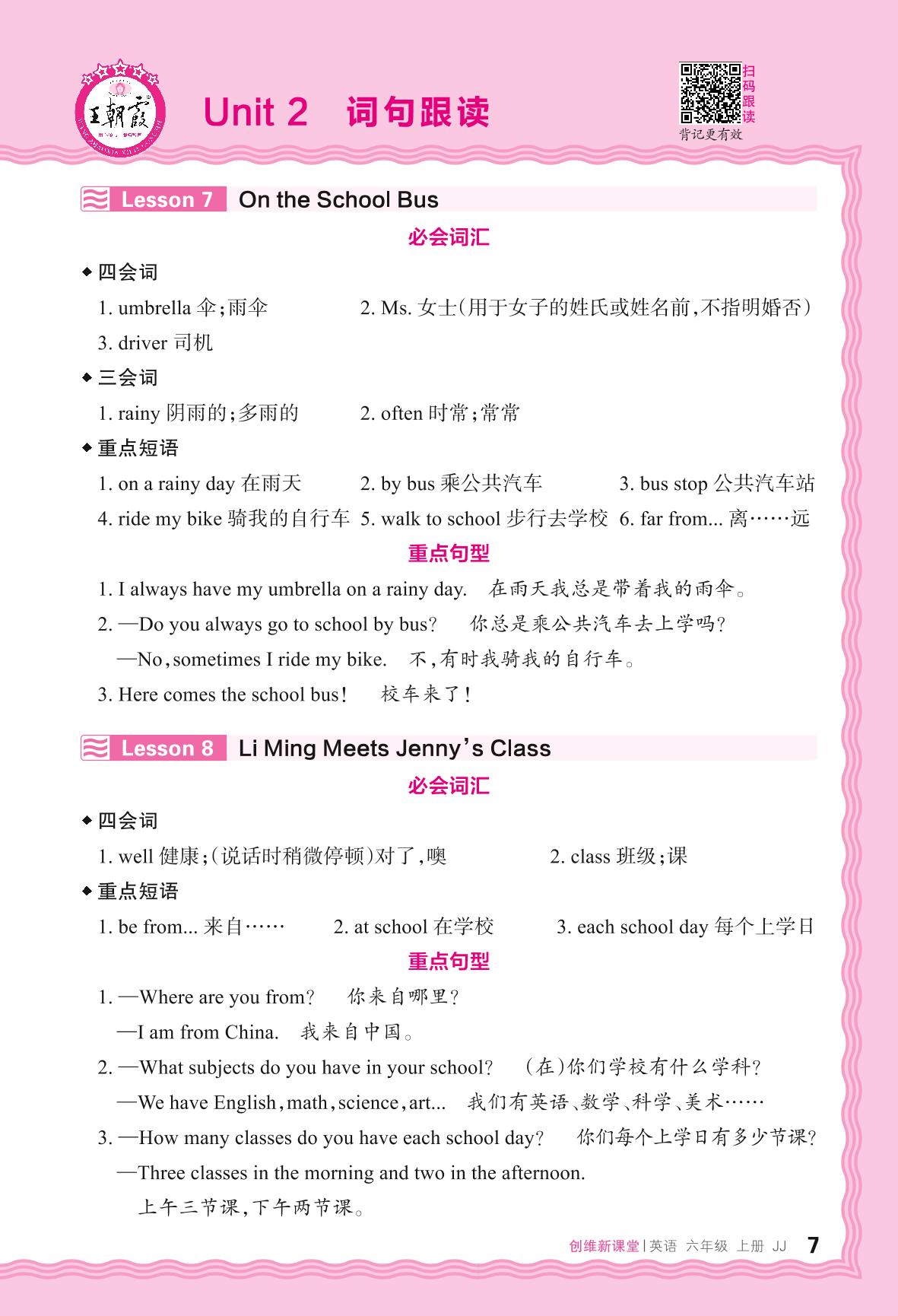 2024秋上册六年级英语冀教版 Unit 2 词句跟读