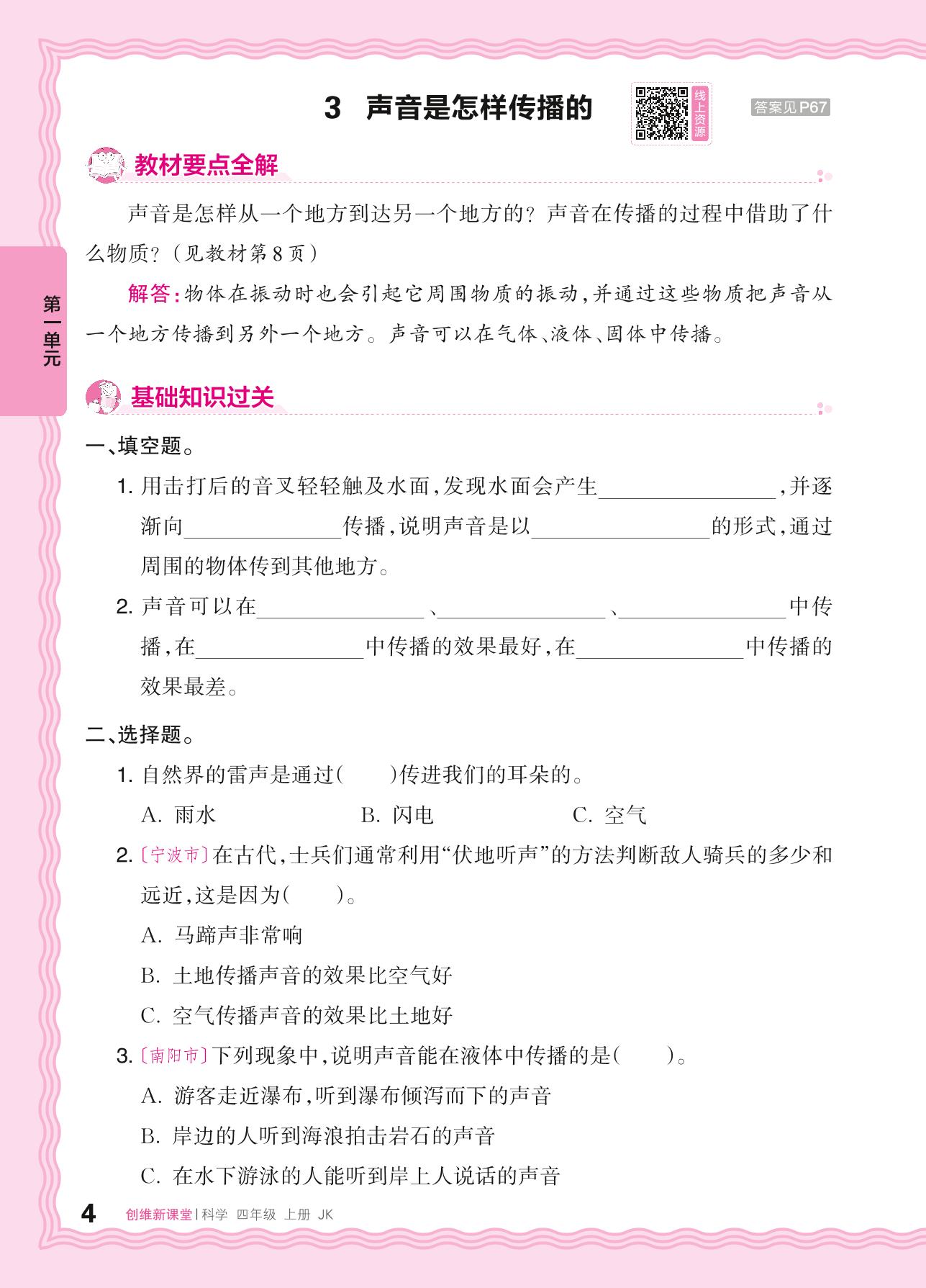 2024秋上册四年级科学教科版 第一单元 声音——3. 声音是怎样传播的
