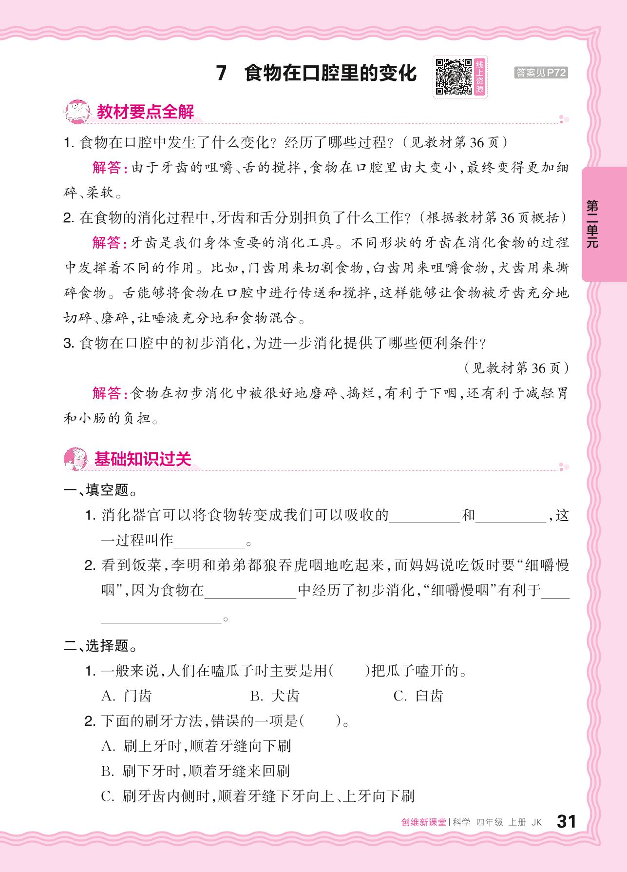 2024秋上册四年级科学教科版 第二单元 呼吸与消化——7. 食物在口腔里的变化