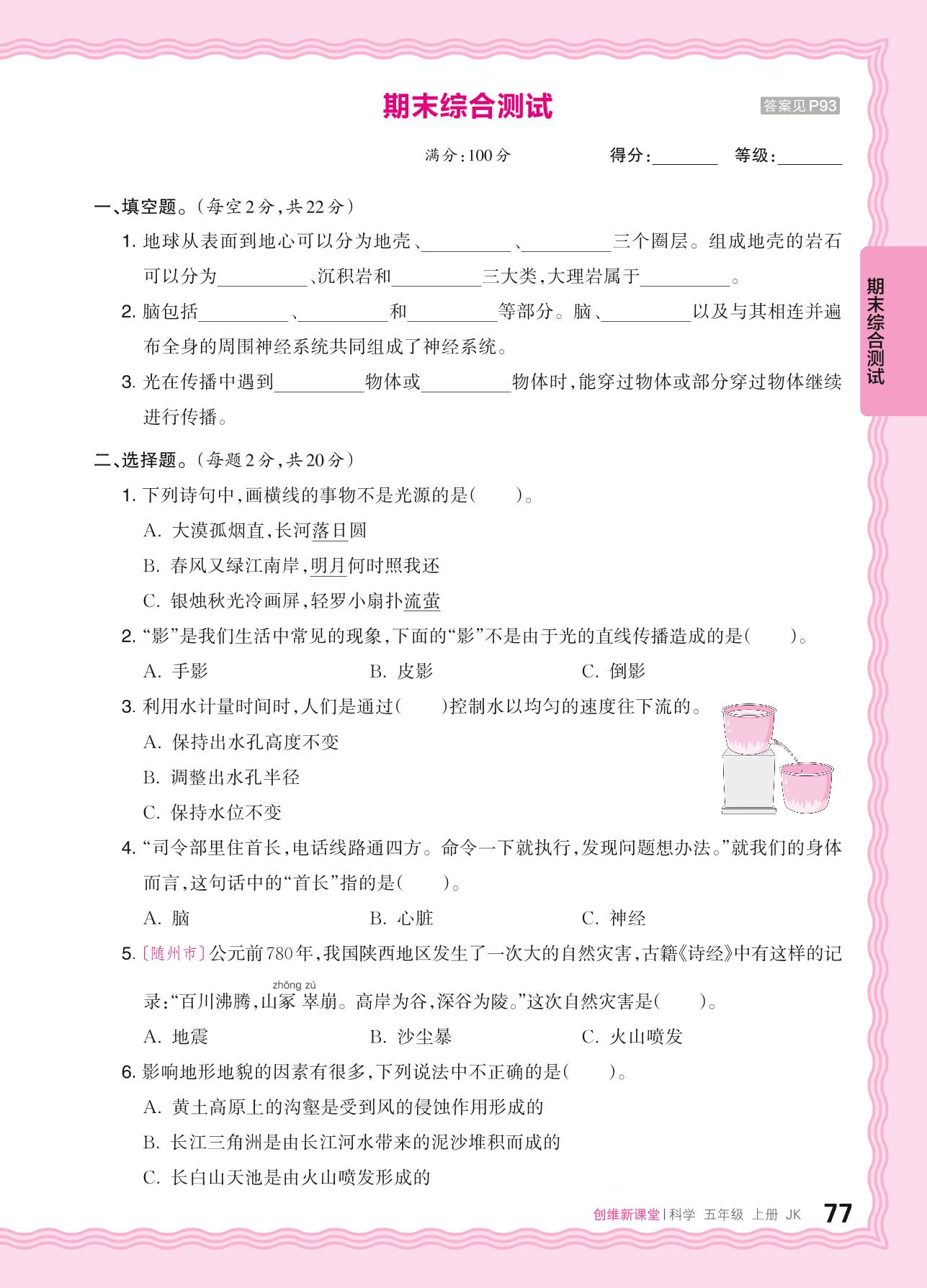 2024秋上册五年级科学教科版 期末综合测试