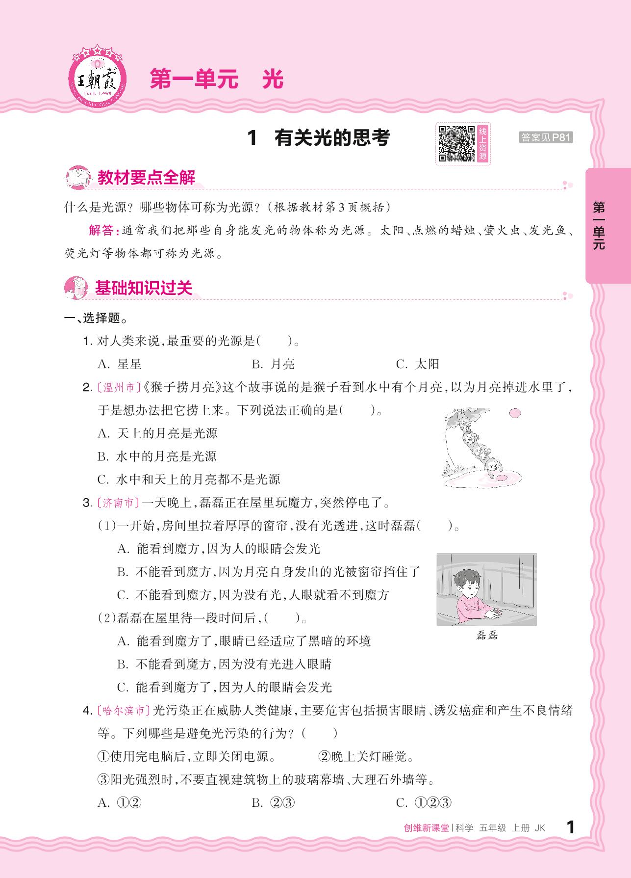 2024秋上册五年级科学教科版 第一单元 光——1. 有关光的思考