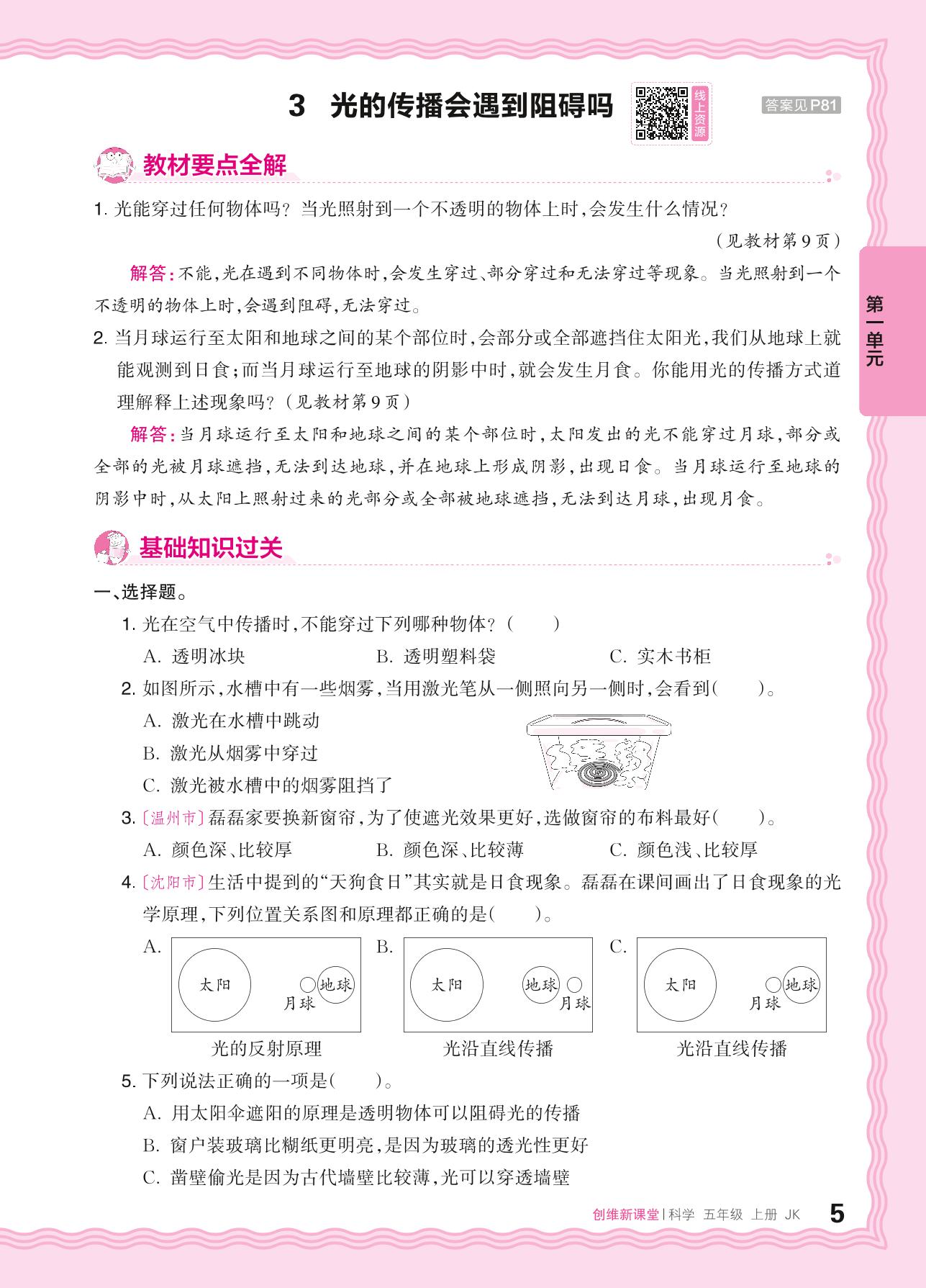 2024秋上册五年级科学教科版 第一单元 光——3. 光的传播会遇到阻碍吗