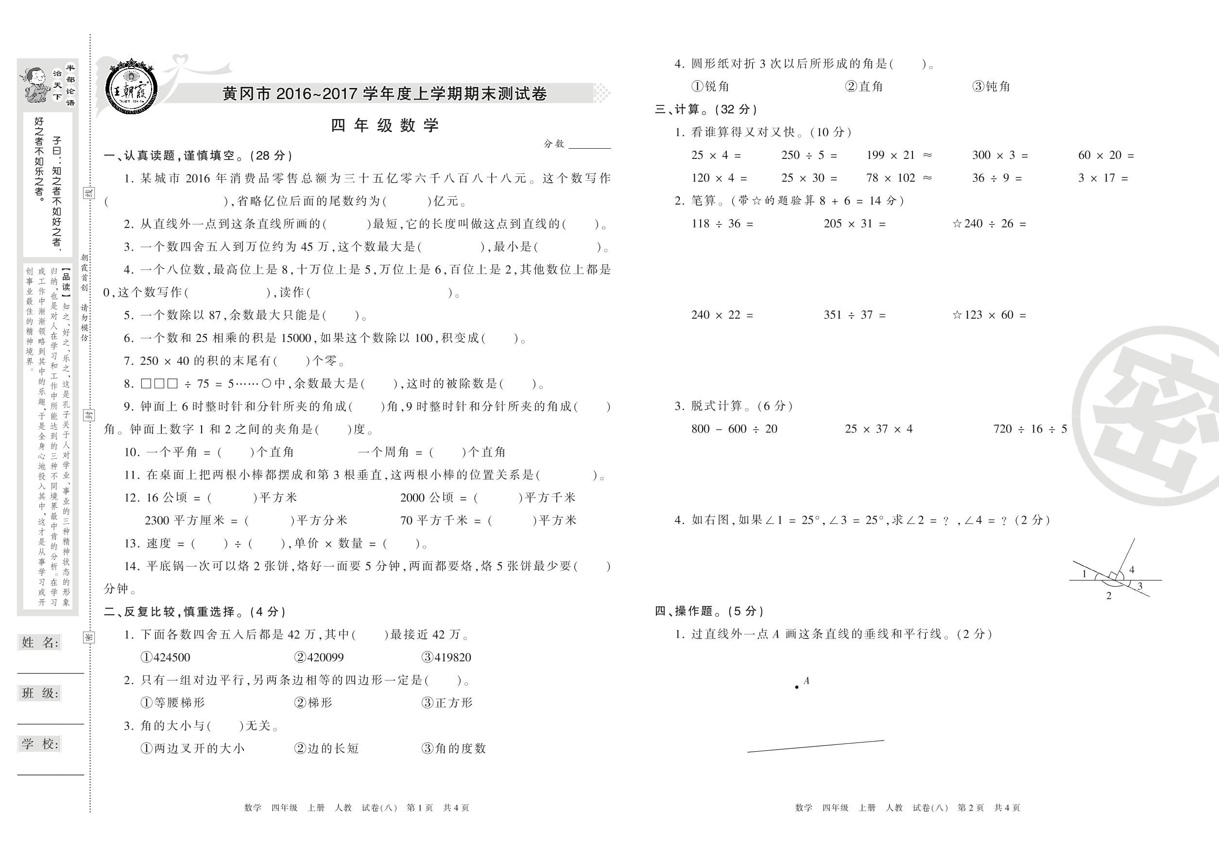 2016-2017学年第一学期黄冈市四年级数学试卷(人教版)【8】