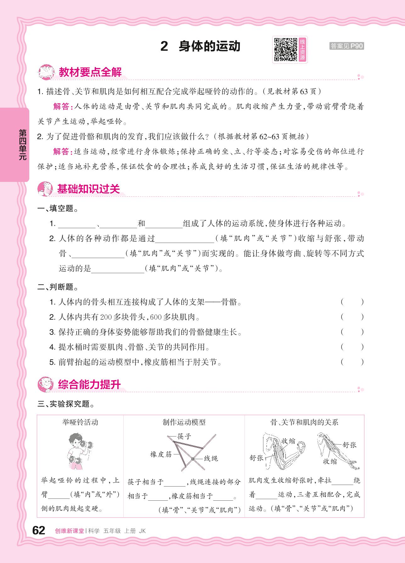 2024秋上册五年级科学教科版 第四单元 健康生活——2. 身体的运动