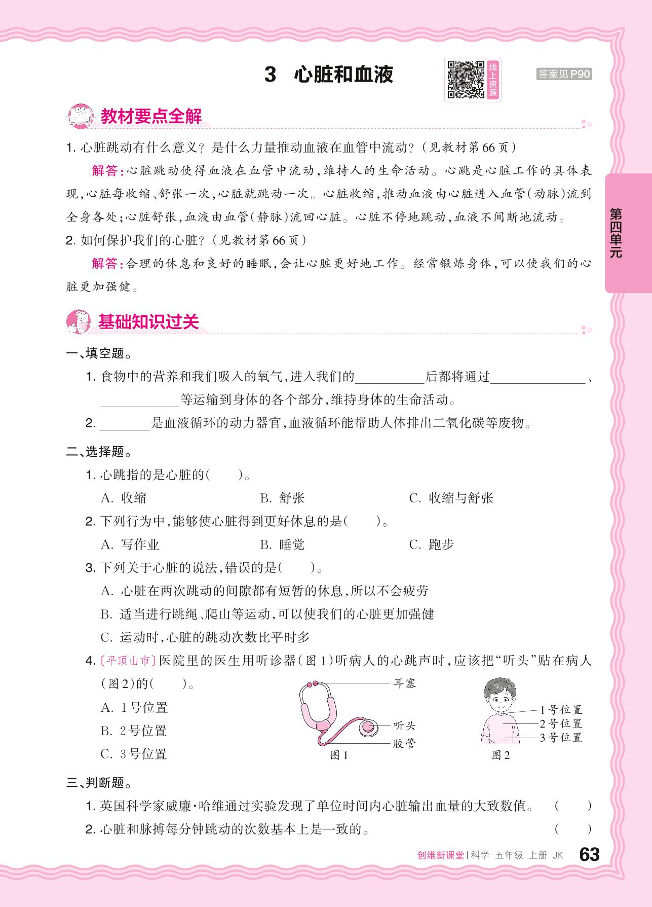 2024秋上册五年级科学教科版 第四单元 健康生活——3. 心脏和血液