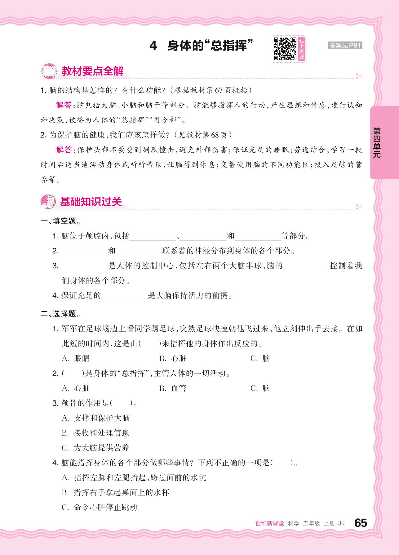 2024秋上册五年级科学教科版 第四单元 健康生活——4. 身体的“总指挥”