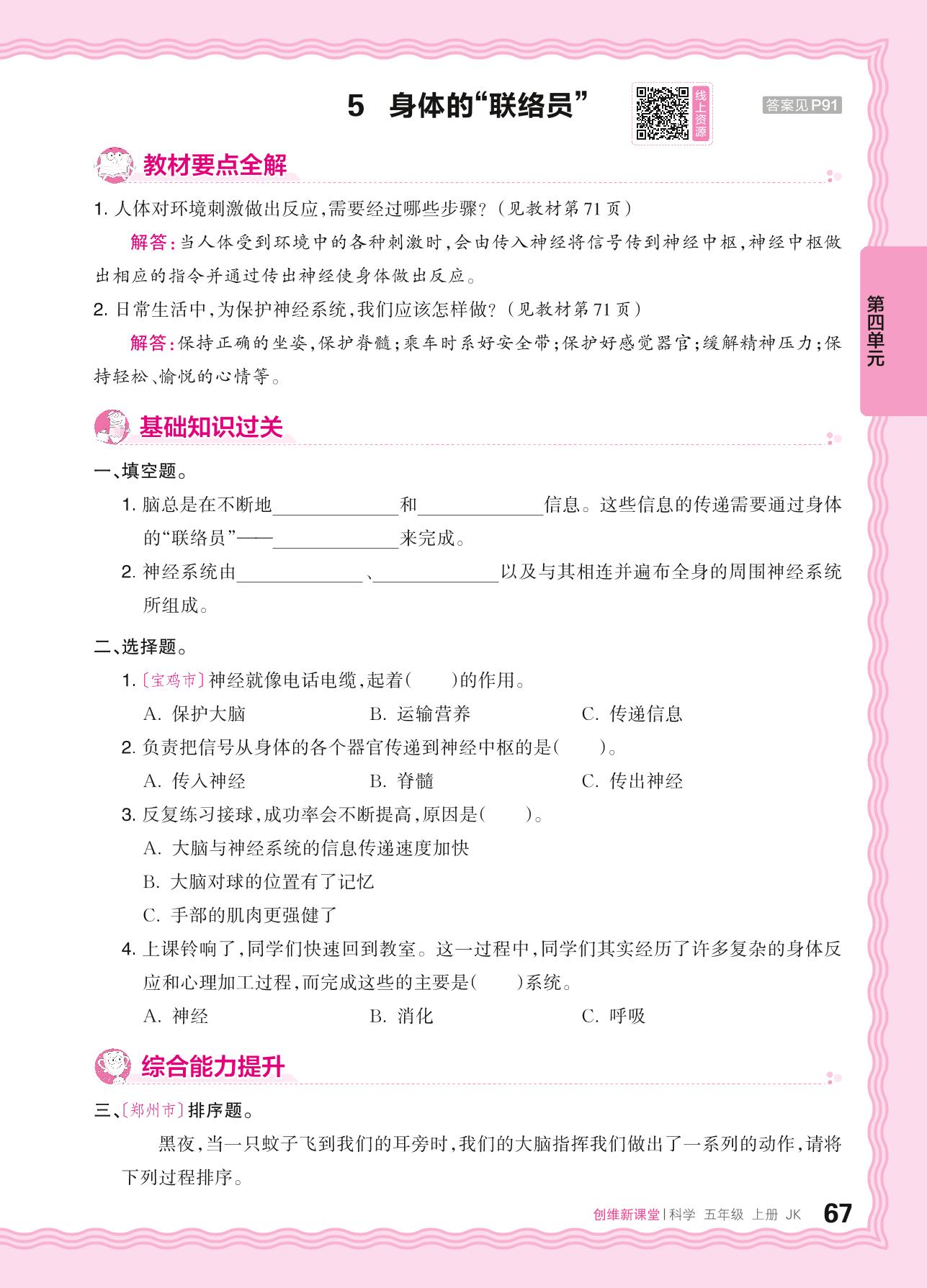 2024秋上册五年级科学教科版 第四单元 健康生活——5. 身体的“联络员”
