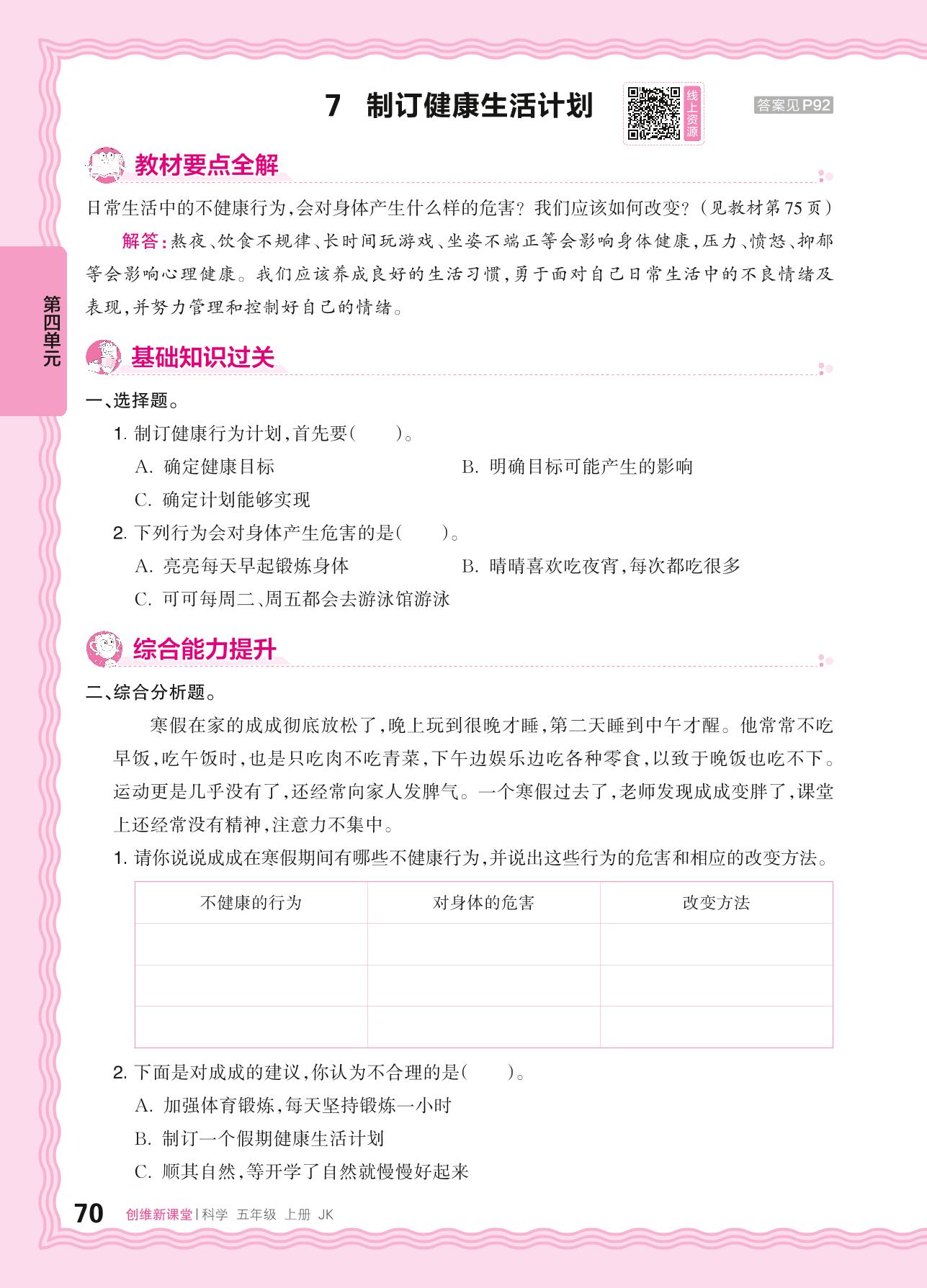2024秋上册五年级科学教科版 第四单元 健康生活——7. 制订健康生活计划