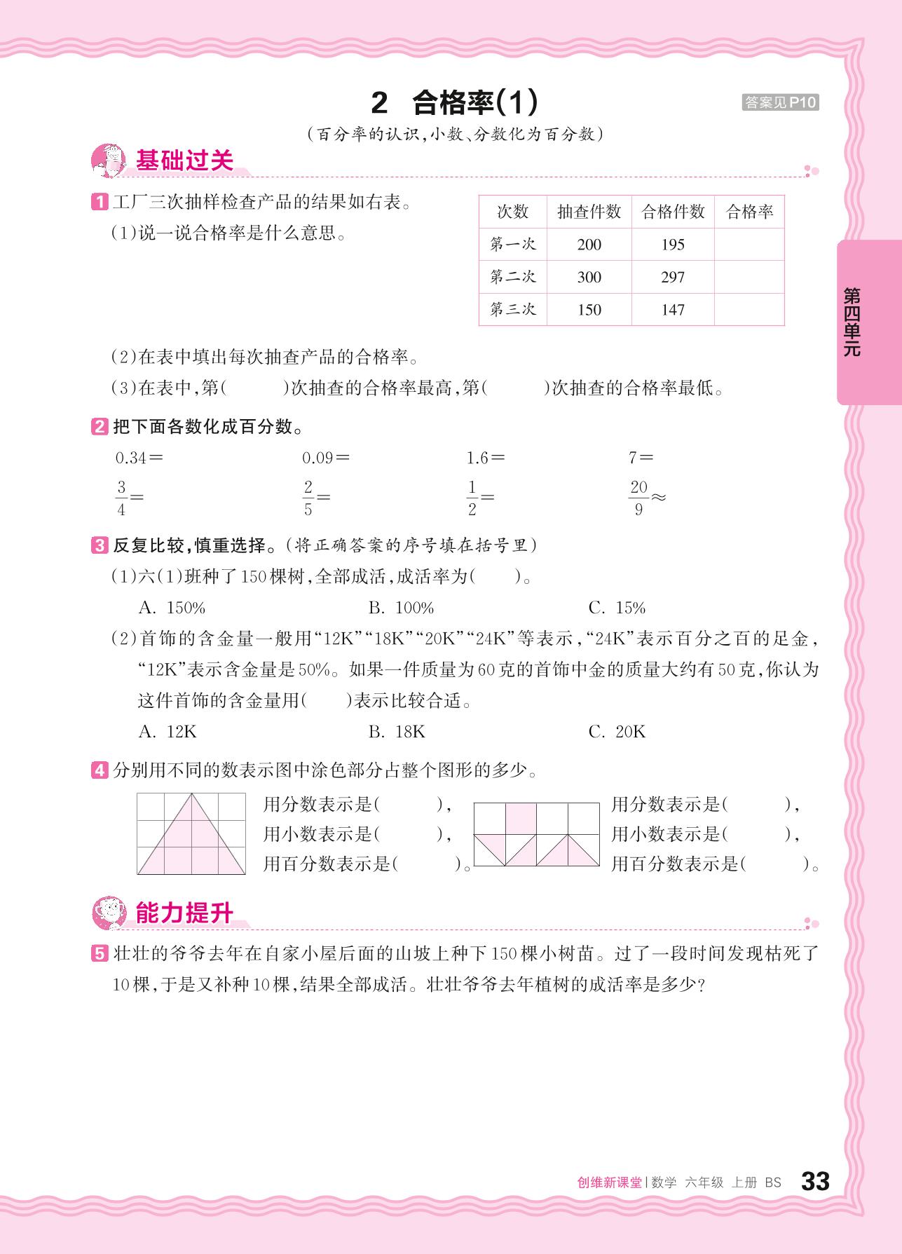 2024秋上册六年级数学北师版 第四单元 百分数——2. 合格率(1)