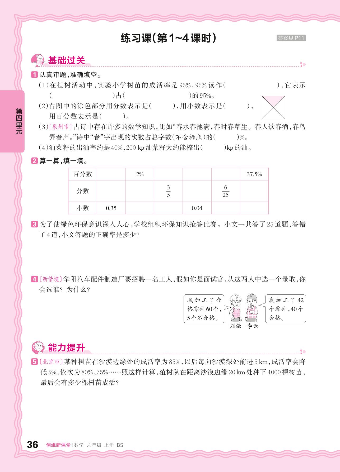2024秋上册六年级数学北师版 第四单元 百分数——百分数的认识、合格率、营养含量练习课
