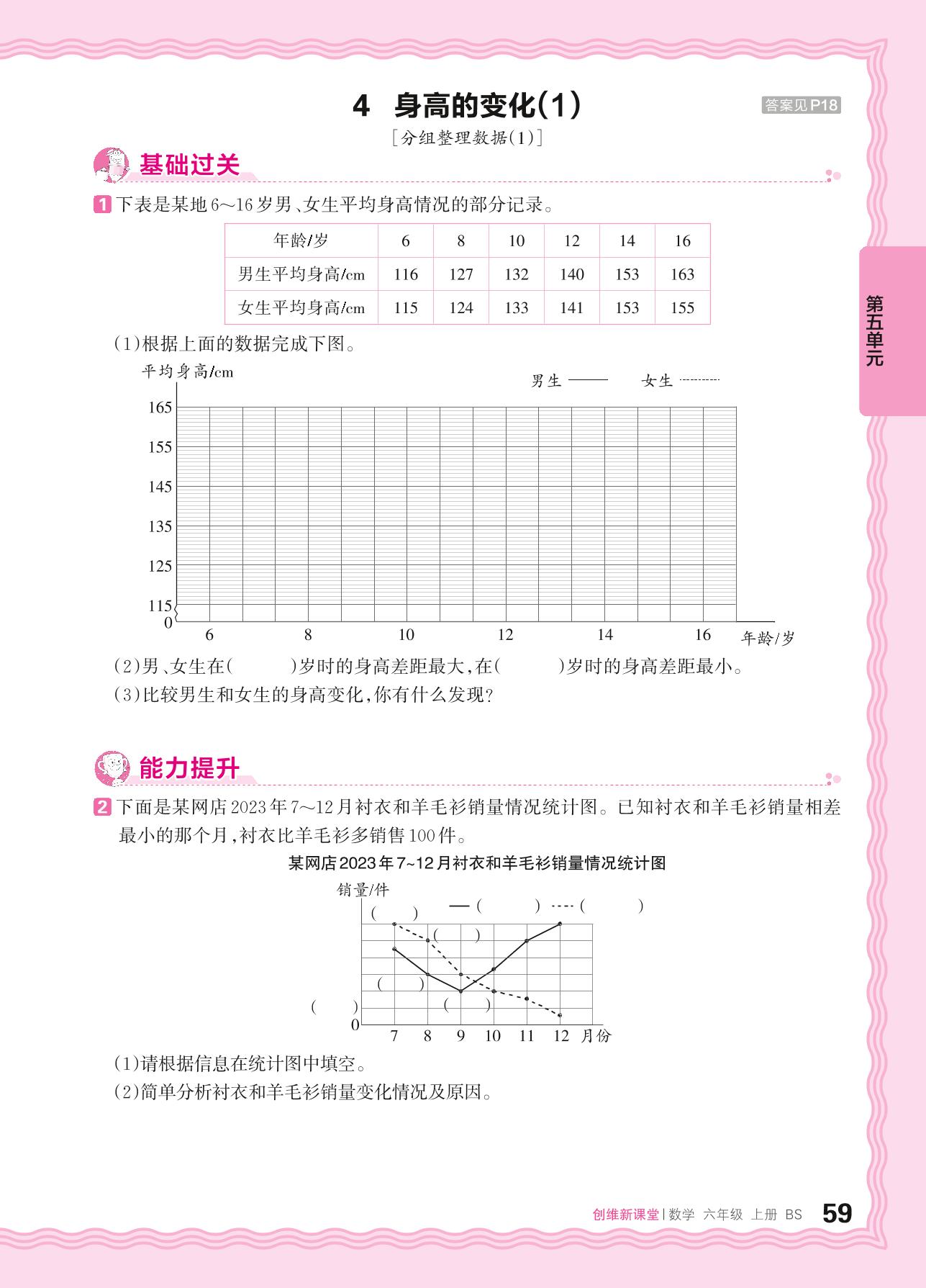 2024秋上册六年级数学北师版 第五单元 数据处理——4. 身高的变化(1)
