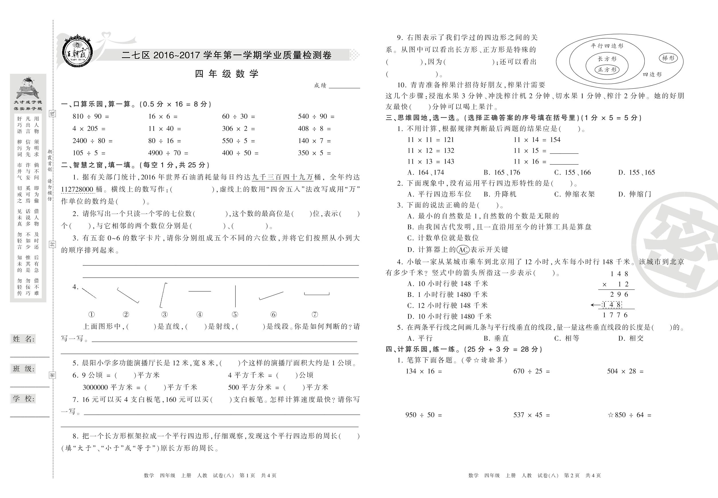 2016-2017学年第一学期郑州市郑汴专版二七区四年级数学试卷(人教版)【8】