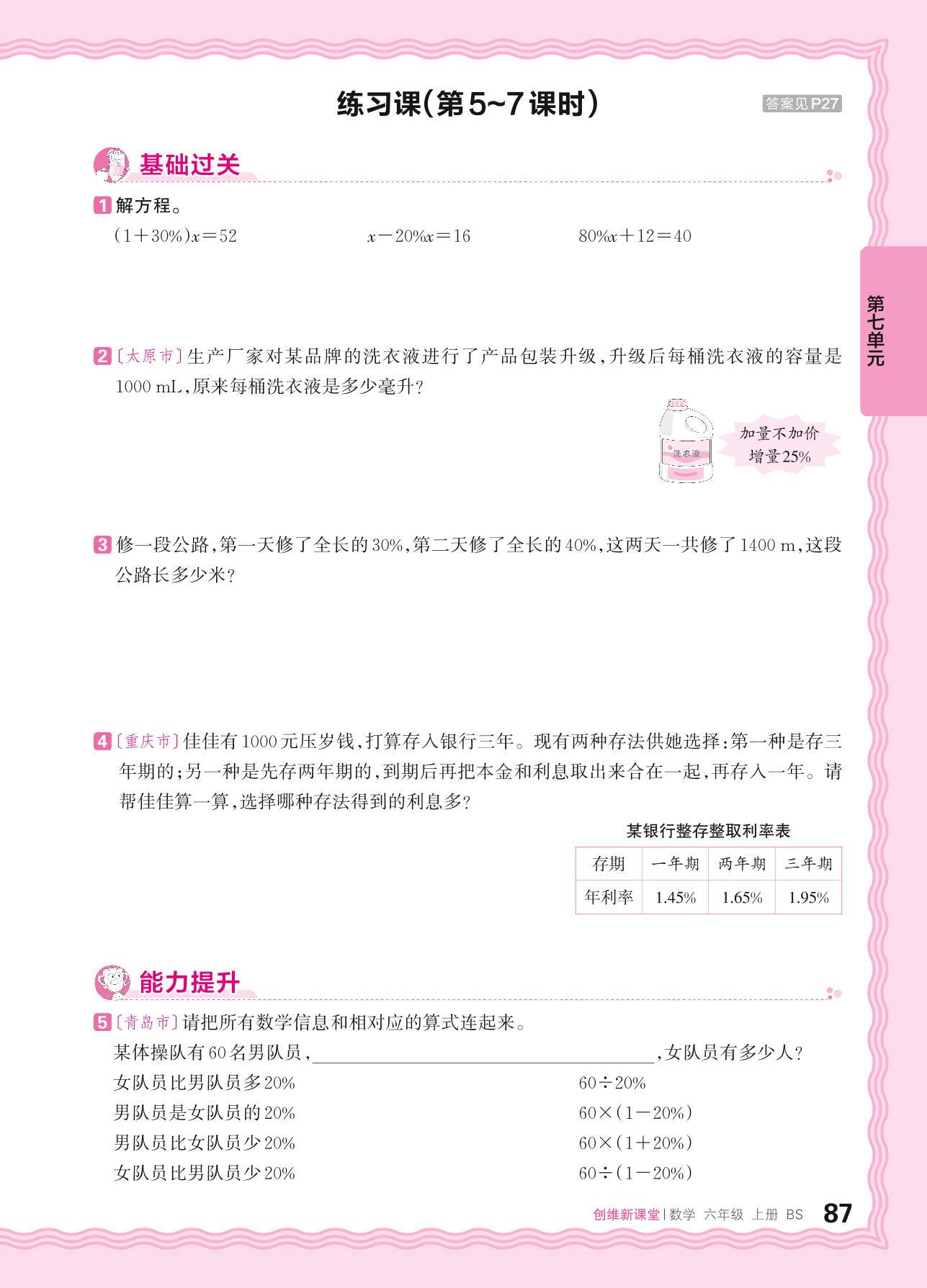 2024秋上册六年级数学北师版 第七单元 百分数的应用——百分数的应用(三)、百分数的应用(四)练习课