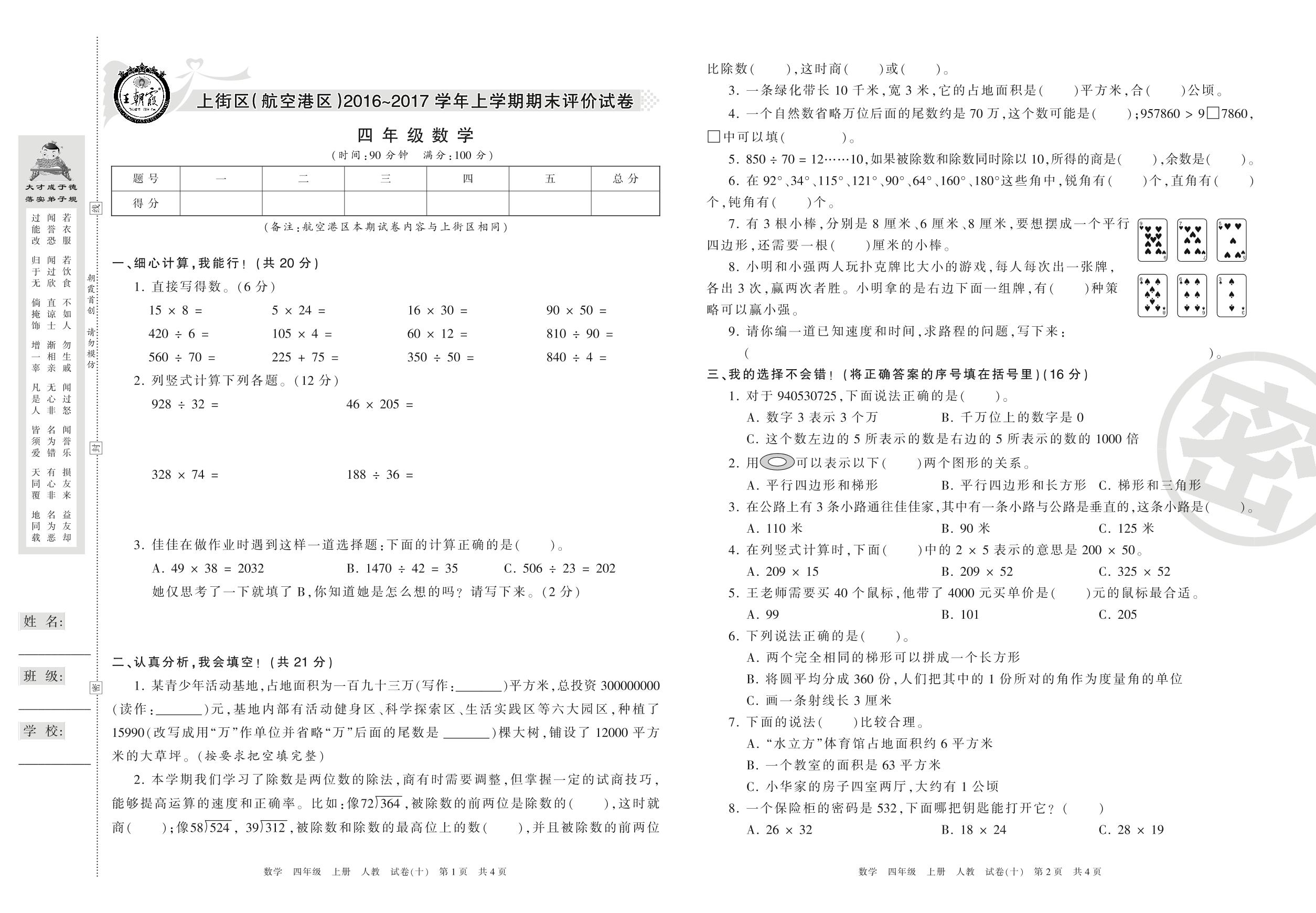 2016-2017学年第一学期郑州市郑汴专版上街区(航空港区)四年级数学试卷(人教版)【10】