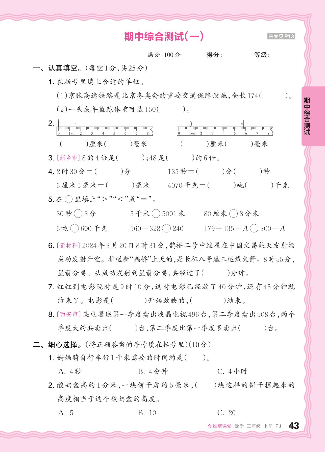 2024秋上册三年级数学人教版 期中综合测试(一)