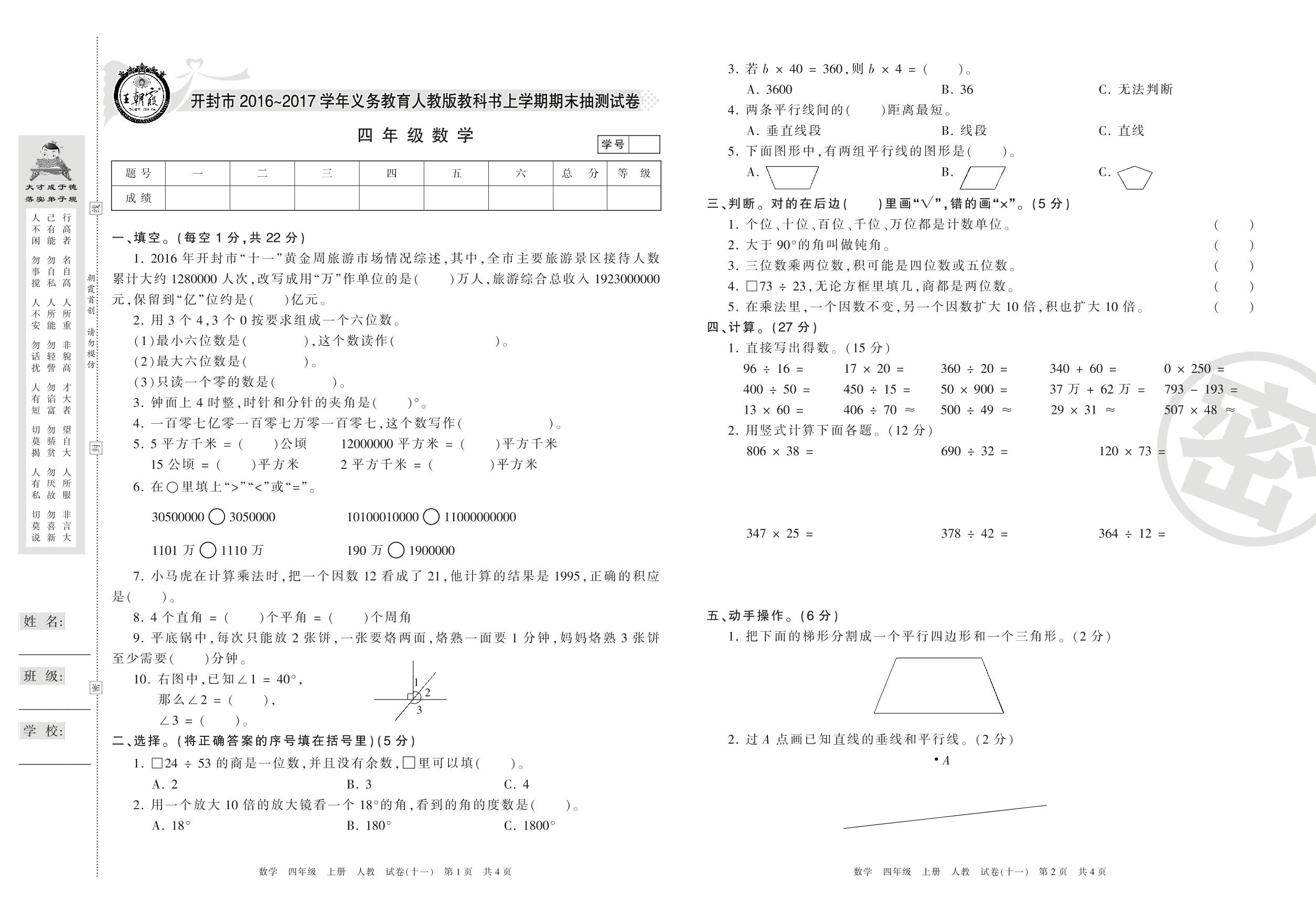 2016-2017学年第一学期开封市四年级数学试卷(人教版)【11】
