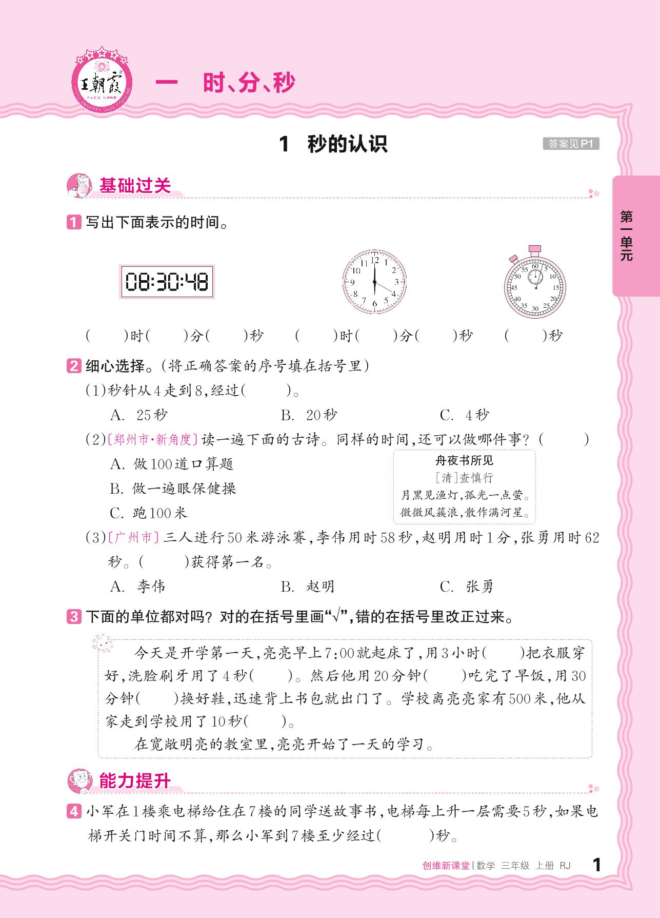 2024秋上册三年级数学人教版 第一单元 时、分、秒——1. 秒的认识