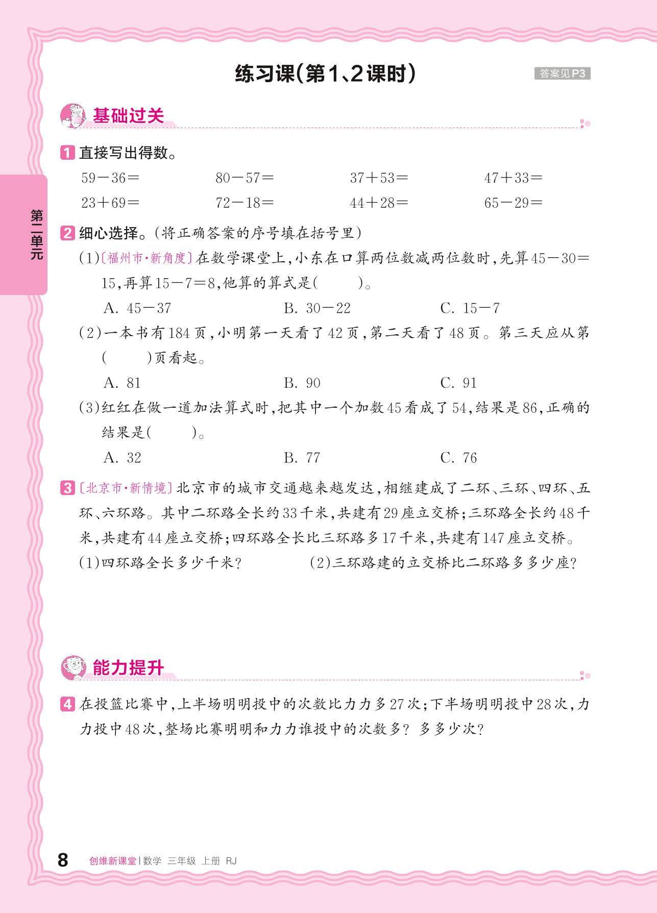 2024秋上册三年级数学人教版 第二单元 万以内的加法和减法(一) ——两位数加、减两位数练习课