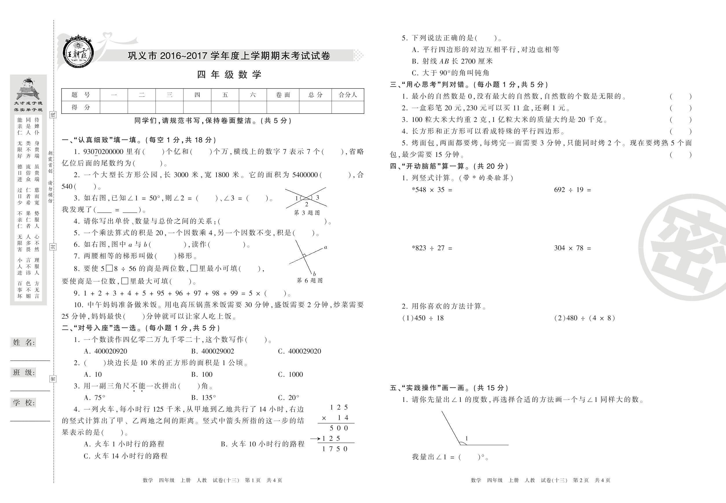 2016-2017学年第一学期巩义市四年级数学试卷(人教版)【13】