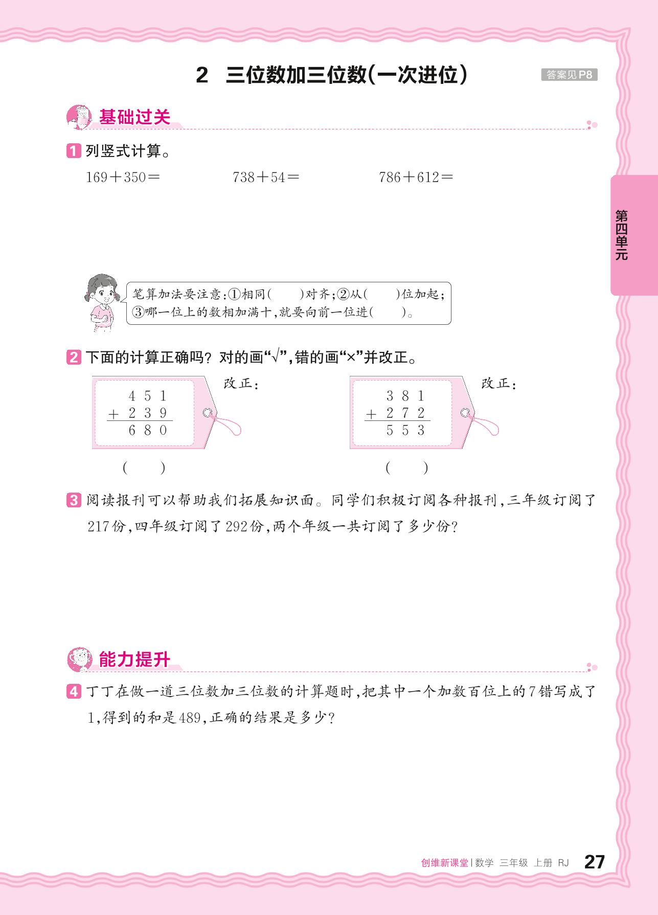 2024秋上册三年级数学人教版 第四单元 万以内的加法和减法(二)——2. 三位数加三位数(一次进位)