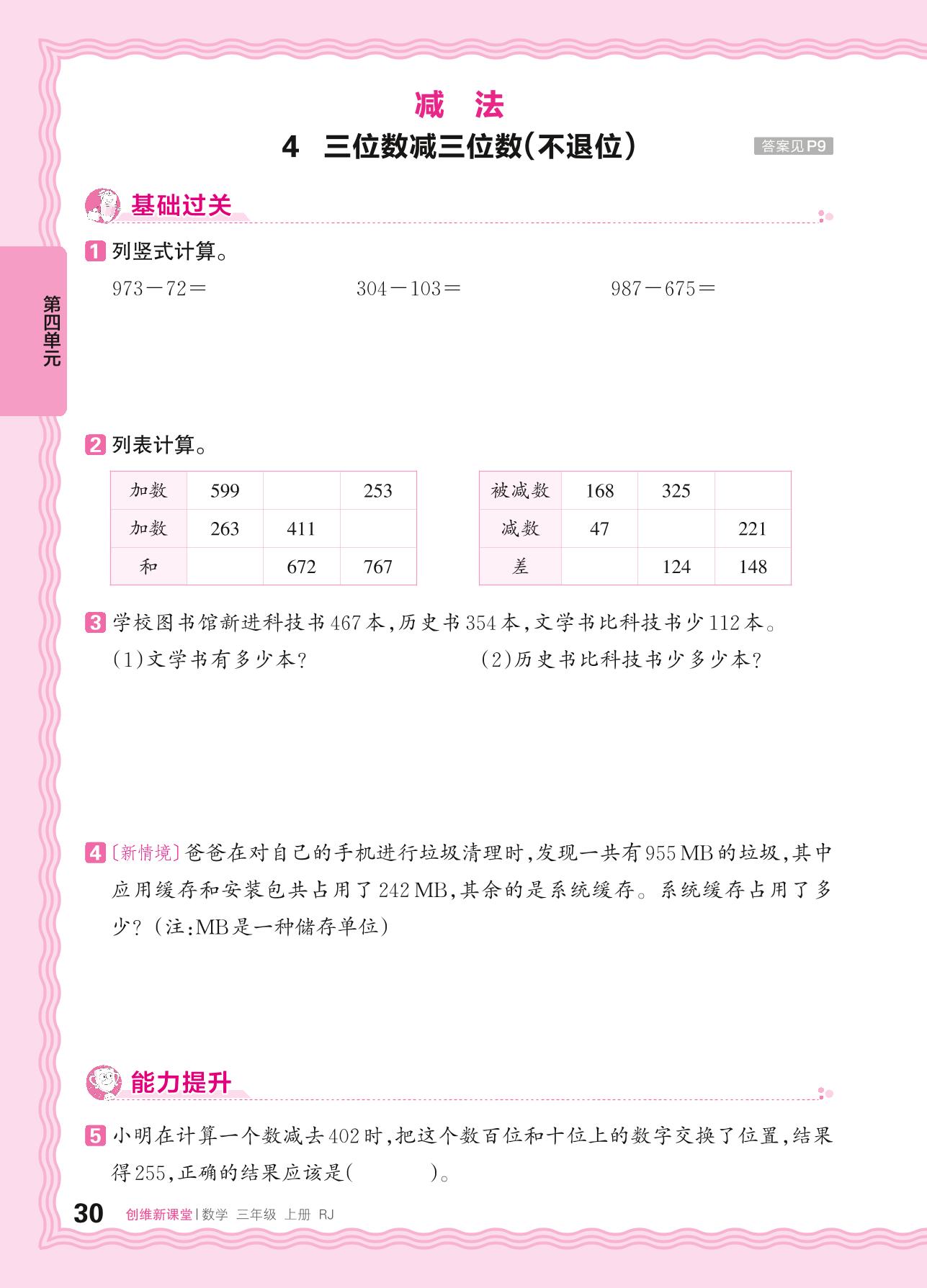 2024秋上册三年级数学人教版 第四单元 万以内的加法和减法(二)——4. 三位数减三位数(不退位)